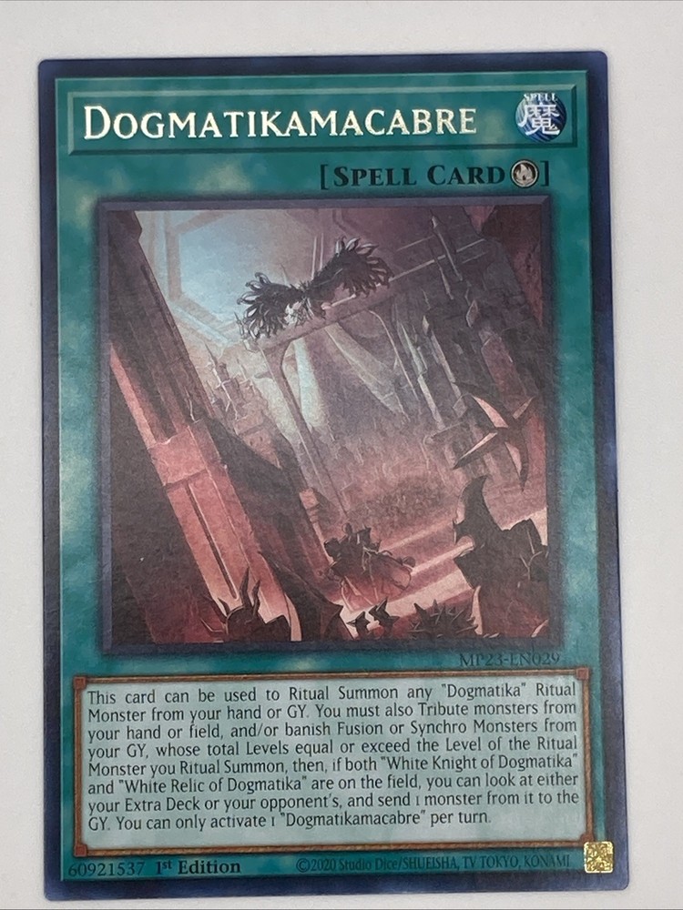 Elevate your Yu-Gi-Oh! TCG gameplay with the inclusion of the rare and powerful Dogmatikamacabre card from the 25th Anniversary Tin: Dueling Heroes Mega Pack. Card number MP23-EN029 features the Spell-Ritual attribute, bringing a strategic depth to your deck. This 1st Edition collectible, crafted by Konami, is a must-have for both seasoned players and collectors alike. Suitable for anyone aged 6 and up, this English language card adds to the rich tapestry of gameplay within the Yu-Gi-Oh! universe. Its unique abilities enhance the interactive nature of the game, making it a valuable addition to your arsenal. Whether it's for competitive play or casual entertainment, Dogmatikamacabre is a gem for your next gaming session. Thank you for viewing our Yu-Gi-Oh cards on eBay! This card has come straight from the booster pack straight to a penny sleeve. If you have any questions or issues, please do not hesitate to reach out to us! We will do everything we can to assist you! Thank You!