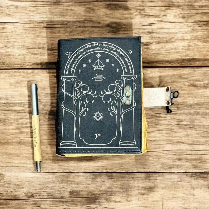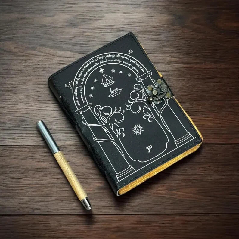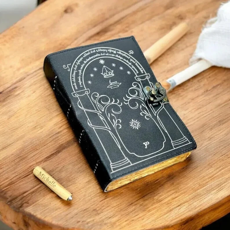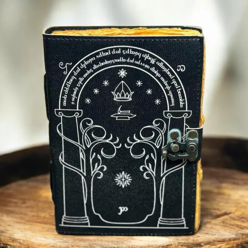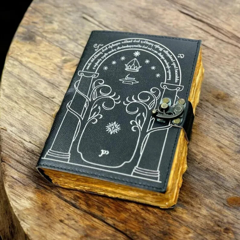 The cover of this journal is Printed with the doors of durin, which I copied from J R Tolkien's original drawing. Size : 7 X 5 Inches. 200 writing pages, and pages are unlined. • Print - doors of durin • Vintage lock closure • Genuine buffalo leather • Vintage deckle edge old paper • handmade rustic cotton paper • 100 Sheet (200 pages both side) ●Readers of Tolkien's 'lord of the rings' will remember the doors of durin, which were the western entrance to the mines of Moria. ●They were built in the Second Age of Middle Earth, probably before Year 1000, at the time when the friendship between the Elves of Eregion and the Dwarves of Khazad-dom was greatest there has ever been between the two peoples. ●They stood until that day in the Third Age, when Gandalf opened the doors with the magic password and the Fellowship of the Ring passed through them, narrowly escaping the Watcher in the Water, which slammed the Doors shut and buried them. ●So the doors of durin are magical doors into a magical world. A fitting cover to a journal in which to explore your own thoughts and dreams and imagination. Some of my customers have also used the design for the cover of a guest book in connection with Tolkien-themed and Medieval-themed weddings. ●leather journal witchcraft book of shadows notebook is made with 200 pages of Antique Paper which looks like it was pulled from history. You will fall in love with the the antique handmade cotton paper which is unique to our vintage journal notebook. ● The vintage clasp lock will keep all your valuable writing locked inside.Sturdy hand stitched binding to make sure that no paper comes out loose from your spell notebook. ● The witchcraft supplies journal is printed with a special seven stone called “Chakra healing” which helps to reveal inner truth within yourself and encourage self-awareness and self expression. We have taken extra to make sure that the emboss is perfect in every piece. ● Sketch, Doodle, Write on your Leather Blank Spell Journal with a Calligraphy Pen Fountain Pen, Brush Pen, Ball Pen, Acrylic Colours, Watercolor and many more. We guarantee no bleed through. ● Can be used as a notepad, journal, writing notebook, sketch book. 1.25 inch thickness, easy for handwriting, drawing or sketching and compact for carrying in your bag. Ideal for alternative ● Artist Sketchbooks, Photo Album, Traveling Notes, Business Executive, Logbook, Poetry Work, Journalists, Food Planner, Instagram Scrapbook and Bible Journaling. ● Best Gift For Your Companion: A Journal Is Like A Trusted Friend. You Can Use It To Solve Queries, Get Inventive, Or Record Valuable Memories For Them To Last Forever Or You Can Just Use It As A Gift For Your Wife, Son, Or A Daughter Or For Some Enthusiastic Writer In Your Family. Even For Looking For A Miraculous spell book Or A D&D Gamer Looking For His Quest Book. ● Perfectly Sized For Multi-Purpose Use: Length 5", Width 1", Height 7" Inches, This Easy To Carry Personal Diary Is Perfect To Use As A Health Journal, Sketchbook, And Poetry Journal. It’s An Ideal Journal Which Records Your Daily Thoughts And Life Lists. And Also Good For Designing, Doodling, Or Calligraphy Of Your Choice.