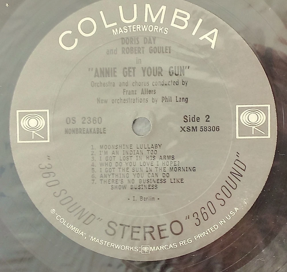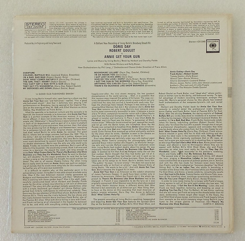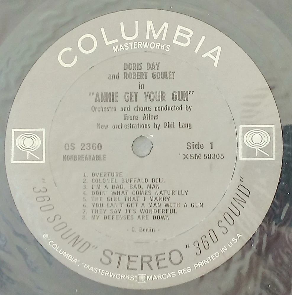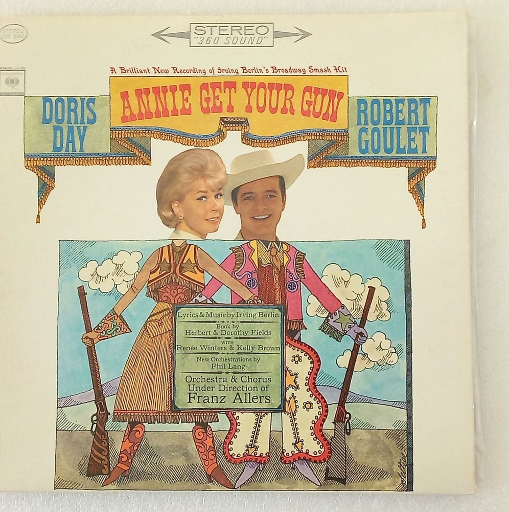 Doris Day And Robert Goulet In "Annie Get Your Gun" Stereo LP -- FREE SHIPPING A new recording (back in 1963) of Irving Berlin's broadway musical hit. Although the record album has been opened, the record itself has never been opened and is still sealed in the plastic envelope it came in. The album jacket cover is still fresh and the only flaw is a small ding in the lower left corner of the front cover. There are no seamsplits or wear to the edges or cover. No bends or creases either. Please see all photos to make your own determination of condition. Please check out my store for more unique and collectable items. All items will be carefully packaged. Check my feedback to see the care and pride I take when packaging items. Free shipping via USPS Media Mail.