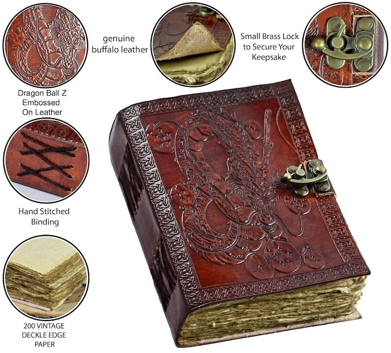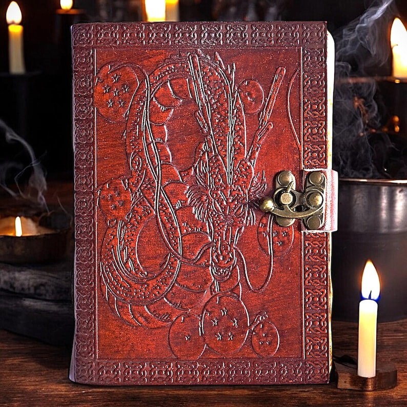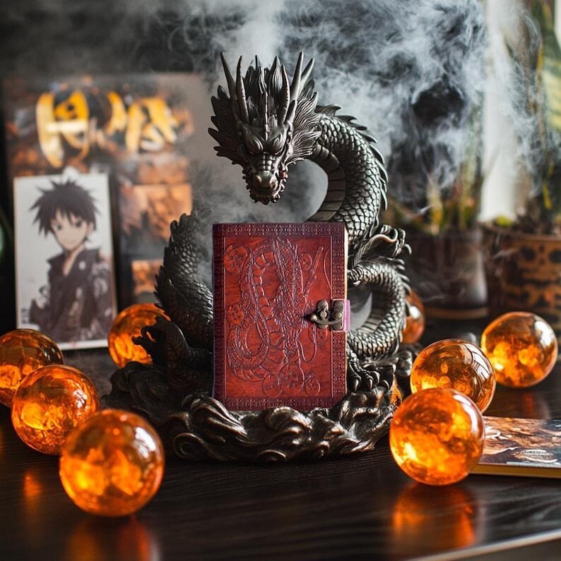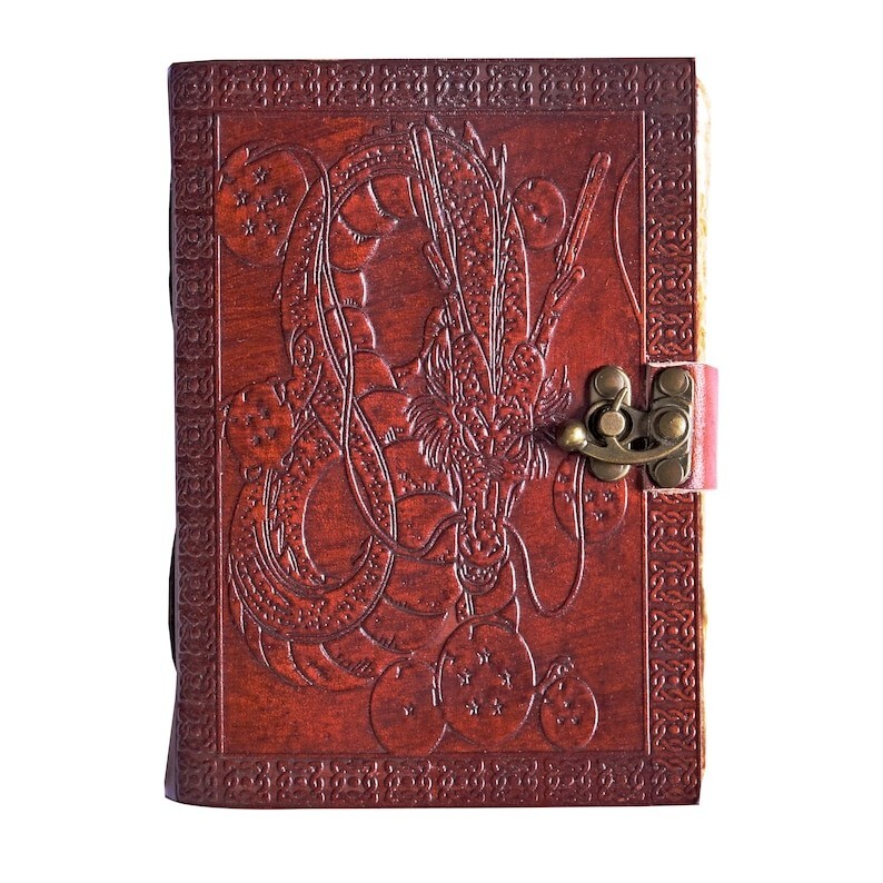 Dragon Ball Z Shenron Embossed Leather Journal – Handmade Grimoire, Book of Shadows, Spell Book, Sketchbook, or Diary Unleash your creativity and channel the legendary power of Shenron with this handcrafted Dragon Ball Z Leather Journal. Whether you’re an artist, writer, or collector, this beautifully embossed notebook serves as a stunning piece for journaling, sketching, spellwork, or storytelling. Exquisite Craftsmanship & Unique Design Handmade with the finest quality leather, this rustic and durable journal is adorned with an intricate embossed design featuring Shenron, the mystical dragon, along with the seven Dragon Balls. The embossing is carefully crafted to provide a tactile and visually striking look, making this a must-have for any Dragon Ball Z fan. Perfect for Various Uses This versatile journal is designed for multiple purposes, including: ✅ Grimoire or Book of Shadows – Ideal for recording spells, rituals, and mystical knowledge. ✅ Artist’s Sketchbook – Thick pages suitable for pencil, ink, and light watercolor work. ✅ Personal Diary or Notebook – Capture thoughts, dreams, and daily musings. ✅ Fantasy Storytelling – A perfect companion for role-playing games, character creation, or world-building. Product Details Print: Fox Print Size: 7 x 5 inches (Portable & Travel-Friendly) Height: 7 inches Width: 5 inches Depth: 1.5 inches (Including Leather Binding) Cover: Genuine Leather with Hand-Embossed Shenron & Dragon Balls Pages: High-quality blank pages, perfect for writing, sketching, and creative work A Thoughtful Gift for Any Occasion Looking for the perfect gift for a Dragon Ball Z enthusiast, fantasy lover, writer, or artist? This embossed leather journal makes a memorable and practical present for birthdays, holidays, or special occasions. Let this Shenron-embossed leather journal be your gateway to creativity and imagination. Summon your inner warrior and start your journey today!