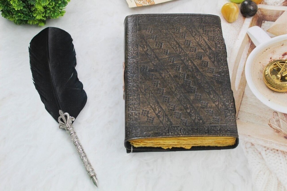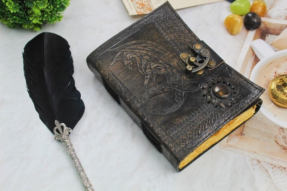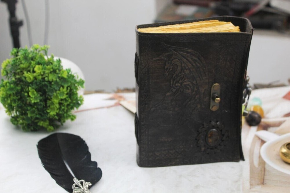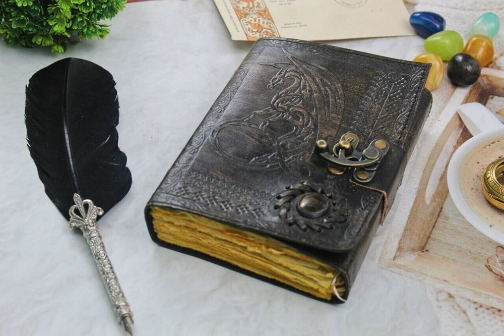 1. This exquisite Dragon Embossed Leather Journal is the perfect gift for anyone who loves to write or sketch. The stone Dream Journal cover adds a touch of elegance and mystique to this beautifully crafted journal. 2. With 200 deckle pages, there is plenty of space to jot down thoughts, dreams, or creative ideas. The brass lock ensures that your writings are kept safe and secure. 3. Whether used as a personal diary, travel journal, or sketchbook, this Dragon Embossed Leather Journal is sure to inspire creativity and imagination in whoever receives it.