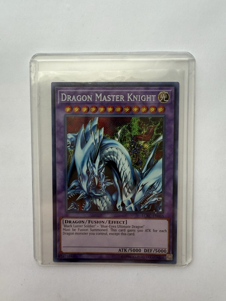 The "Dragon Master Knight" card is from the Legendary Collection Kaiba set in the Yu-Gi-Oh! TCG. This Secret Rare card is an Effect Fusion Monster with 5000 Attack and 5000 Defense points, making it a powerful Dragon-type monster. Manufactured by Konami, this English language card is part of the Unlimited edition, allowing players to use it in their decks for gameplay. With its impressive stats and rarity, the Dragon Master Knight card is a sought-after collectible for fans of the game.