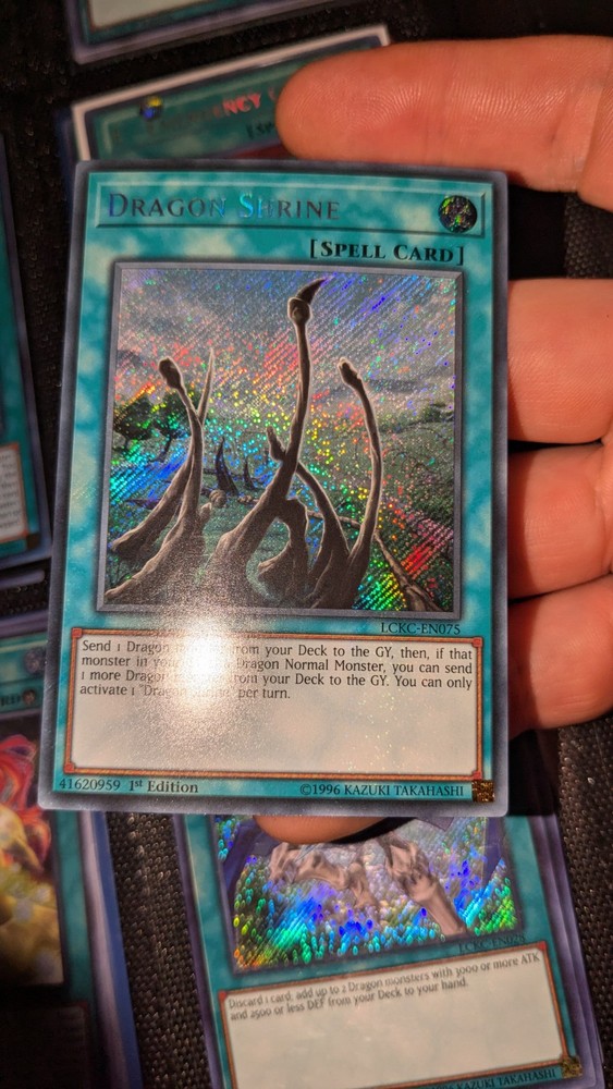 This Dragon Shrine card from the Legendary Collection Kaiba set is a must-have for any Yu-Gi-Oh! TCG collector. With its Secret Rare rarity and 1st Edition feature, it is a valuable addition to any collection. The card is in English language and has the card number LCKC-EN075. The Dragon Shrine card is a Spell-Normal type and has the attribute of Spell. It is manufactured by Konami and is suitable for play in the Yu-Gi-Oh! TCG game. Don't miss the opportunity to own this exclusive card.