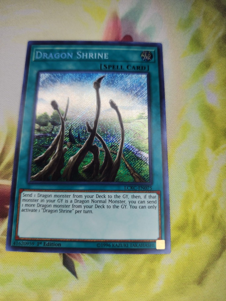 The product is a "Dragon Shrine" card from the Legendary Collection Kaiba set in the Yu-Gi-Oh! TCG. It is a Secret Rare 1st Edition Spell card with the ability to send Dragon monsters from the Deck to the Graveyard. The card has the card number LCKC-EN075 and can only be activated once per turn.