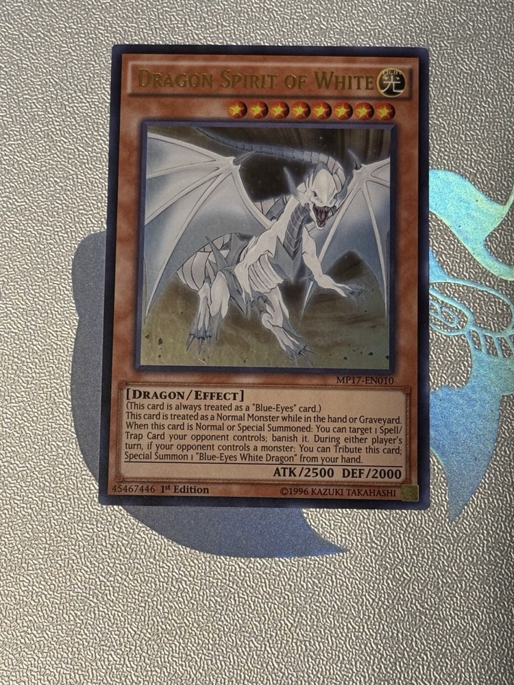 The "Dragon Spirit of White" card is from the 2017 Mega-Tins Mega Pack set of the Yu-Gi-Oh! TCG. This Ultra Rare card is an English 1st Edition featuring a Dragon creature type with impressive stats of 2500 Attack and 2000 Defense. Known for its Light attribute, this card carries an impactful Effect that makes it a valuable addition to any player's deck. Manufactured by Konami, this card is a sought-after collectible for fans of the game.
