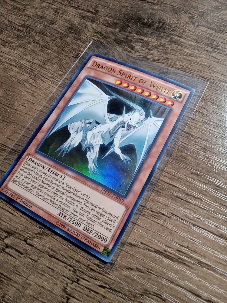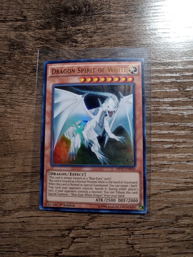 The "Dragon Spirit of White" card is from the 2017 Mega-Tins Mega Pack in the Yu-Gi-Oh! TCG. It is an Ultra Rare card with 2500 Attack and 2000 Defense points, belonging to the Dragon creature type. The card has a Level of 8 and is always treated as a "Blue-Eyes" card, with effects that allow players to target and banish Spell/Trap Cards controlled by the opponent, as well as to Special Summon a "Blue-Eyes White Dragon" from the hand by Tributing this card. This 1st Edition card is in English and features the iconic "Blue-Eyes" theme.