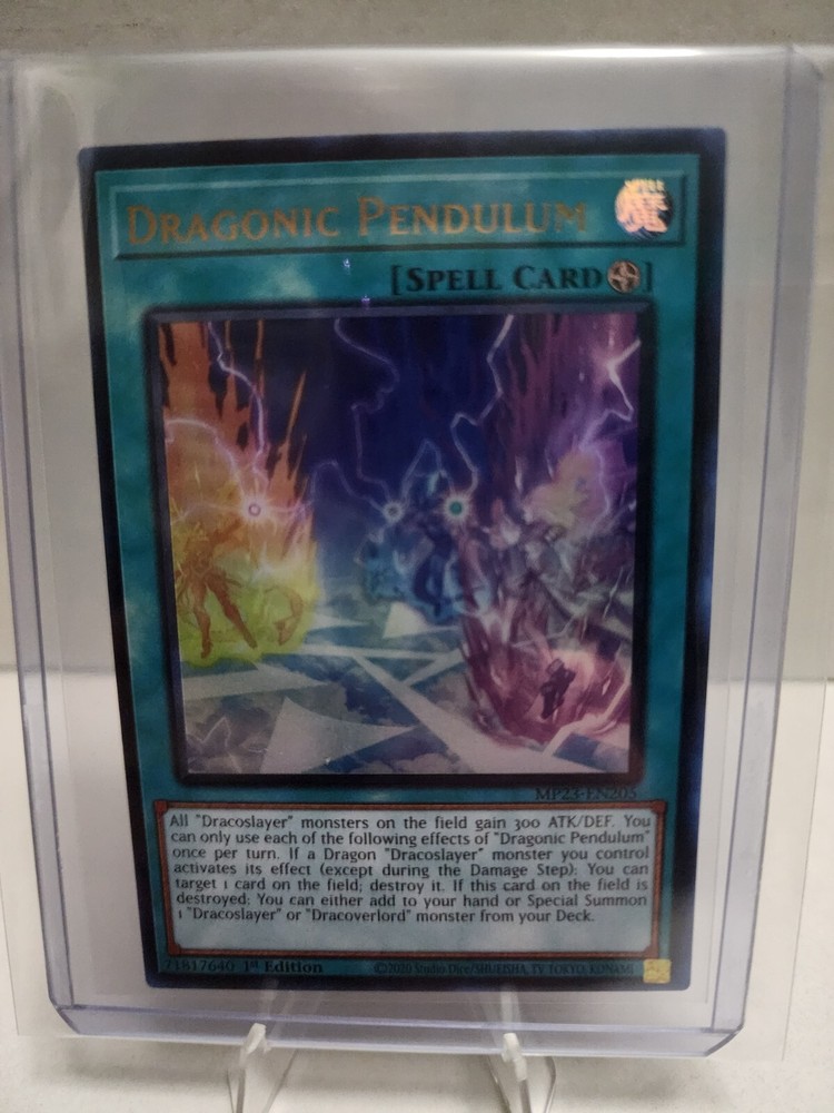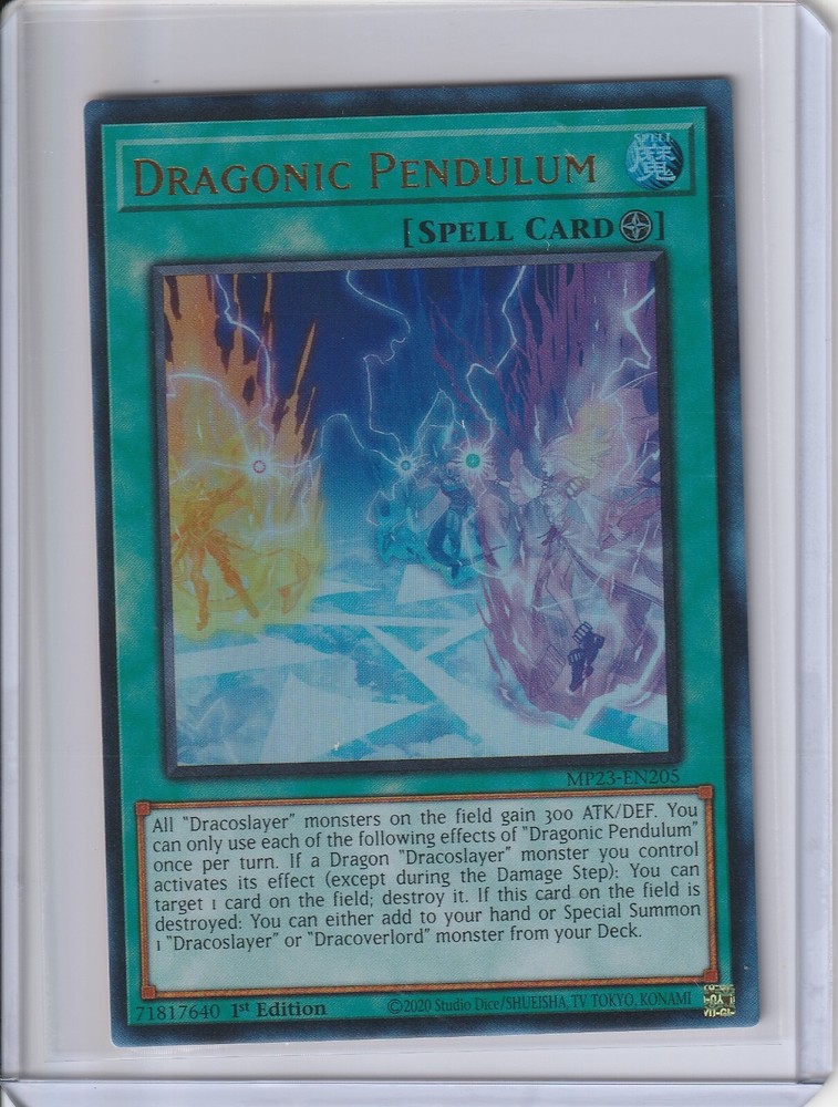 The product is the "Dragonic Pendulum" card from the 25th Anniversary Tin: Dueling Heroes Mega Pack set in the Yu-Gi-Oh! TCG. This Ultra Rare 1st Edition Spell-Field card has the card number MP23-EN205 and is in English. Manufactured by Konami, it is geared towards players aged 6 and above. The card features a unique design and is sought after by collectors and players alike in the realm of collectible card games. Personal Collection in Penny Sleeves, along with top loader, any questions, feel free to ask.