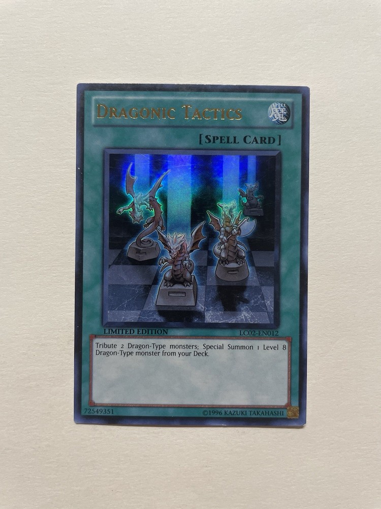 The Dragonic Tactics LC02-EN012 card is a highly sought-after ultra rare card from the Yu-Gi-Oh Legendary Collection 2-Limited Edition. Manufactured by Konami, this English language card features the attribute of "Spell" and is a part of the Yu-Gi-Oh TCG game. With a defense/toughness of 0 and an attack/power of 0, this limited edition card is a valuable addition to any collector's card collection.