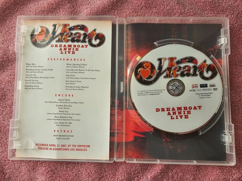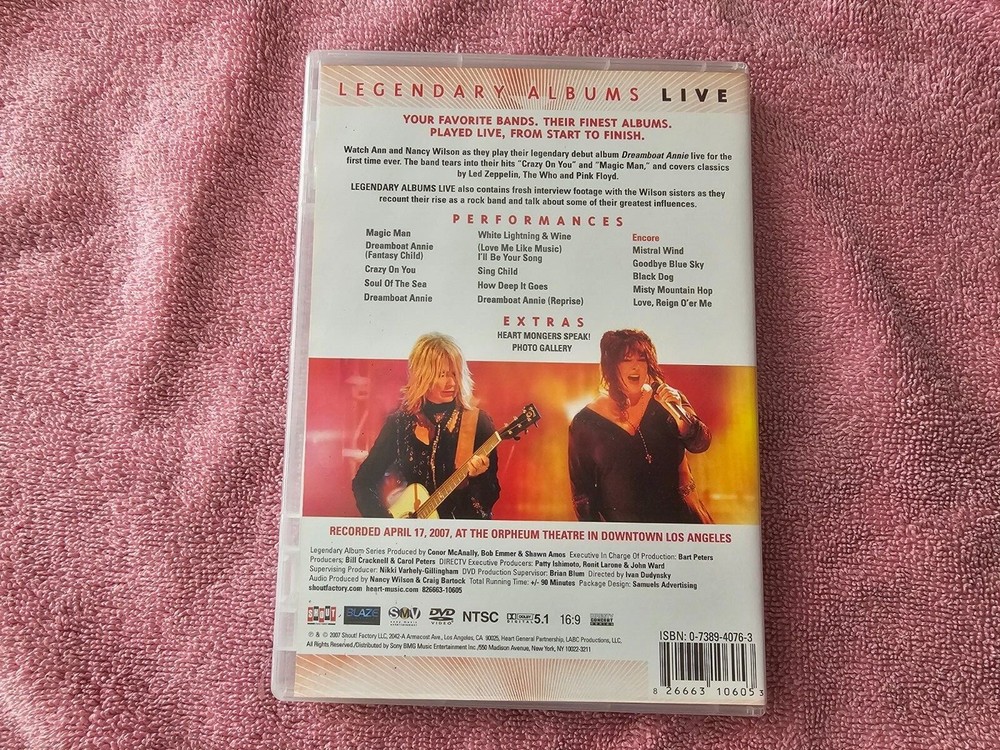 Duration 90min. Number of Discs 1 Tracks 1.1 Magic Man [DVD][Live] 1.2 Dreamboat Annie (Fantasy Child) [DVD][Live] 1.3 Crazy on You [DVD][Live] 1.4 Soul of the Sea [DVD][Live] 1.5 Dreamboat Annie [DVD][Live] 1.6 White Lightning ; Wine [DVD][Live] 1.7 (Love Me Like Music) I'll Be Your Song [DVD][Live] 1.8 Sing Child [DVD][Live] 1.9 How Deep It Goes [DVD][Live] 1.10 Dreamboat Annie (Reprise) [DVD][Live] 1.11 Mistral Wind [DVD][Live] 1.12 Goodbye Blue Sky [DVD][Live] 1.13 Black Dog [DVD][Live] 1.14 Misty Mountain Hop [DVD][Live] 1.15 Love, Reign O'er Me [DVD][Live] 1.16 Bonus Materials [DVD] Title: Dreamboat Annie Live Format: DVD Label: Shout Factory Genre: Rock, Music Video (Concert/Performance) UPC: 826663106053 Release Date: 2007 On the first release in the new Legendary Albums Live series, sisters Ann and Nancy Wilson revisit their very first triumph, live on stage, in front of an ecstatic audience. Thrill as they play their legendary debut album Dreamboat Annie live for the first time ever. The band tears into their hits "Crazy on You" and "Magic Man" and covers classics by Led Zeppelin, the Who and Pink Floyd, all of which inspired them as they were writing and recording Dreamboat Annie. Heart's first-ever live DVD, formatted to 16:9 and featuring a Dolby Digital 5.1 audio mix, and loaded with interviews and other special features.