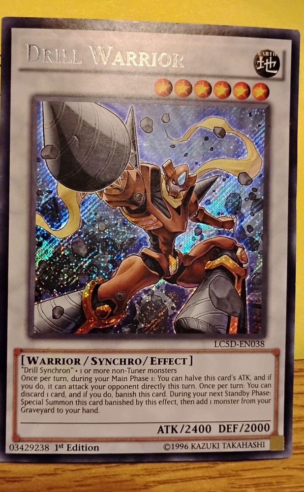 The "Drill Warrior" card is from the Yu-Gi-Oh! TCG Legendary Collection 5D's set and is a Secret Rare card with the card number LC5D-EN038. It is a Warrior-type monster with 2400 Attack and 2000 Defense points, belonging to the Earth attribute. The card is a Synchro Effect card and is in English language with 1st Edition features, manufactured by Konami. This collectible card game item is sought after by players and collectors for its rarity and gameplay potential.