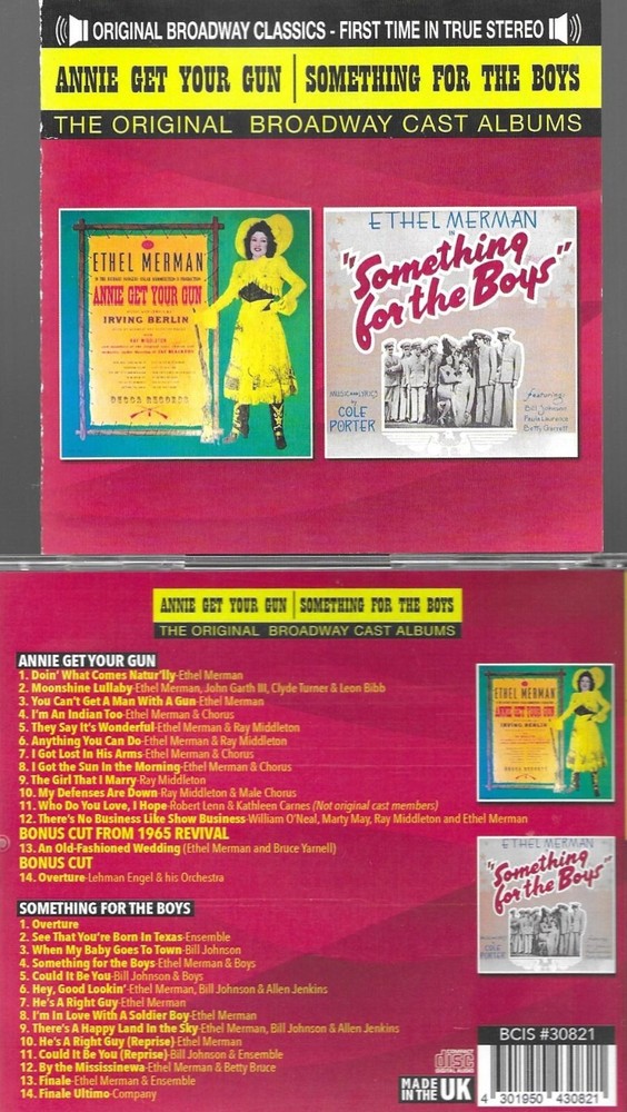 merMAN ALBUMS HERE. ONE IS ANNIE GET YOUR GUN, THE ORIGINAL BROADWAY CAST. THIS WAS ONE OF THE BIGGEST BROADWAY MUSICALS IN THE 1940S AND ETHEL MERMAN’S MOST FAMOUS ROLE. THE OTHER SOMETHING FOR THE BOYS WAS A BIG HIT FOR HER IN THE 1940S AS WELL. BY THE WAY, A COUPLE OF SELECTIONS ON SOMETHING FOR THE BOYS ARE IN STEREO BY ACCIDENT BUT THE REST WERE MONO…The long-awaited remaster finally delivers! Ethel Merman’s powerhouse vocals shine in stunning clarity, with instruments and backing vocals beautifully separated for a rich, immersive stereo experience. These Broadway classics sound fresh and vibrant—like hearing them for the first time. A must-have for theater fans!