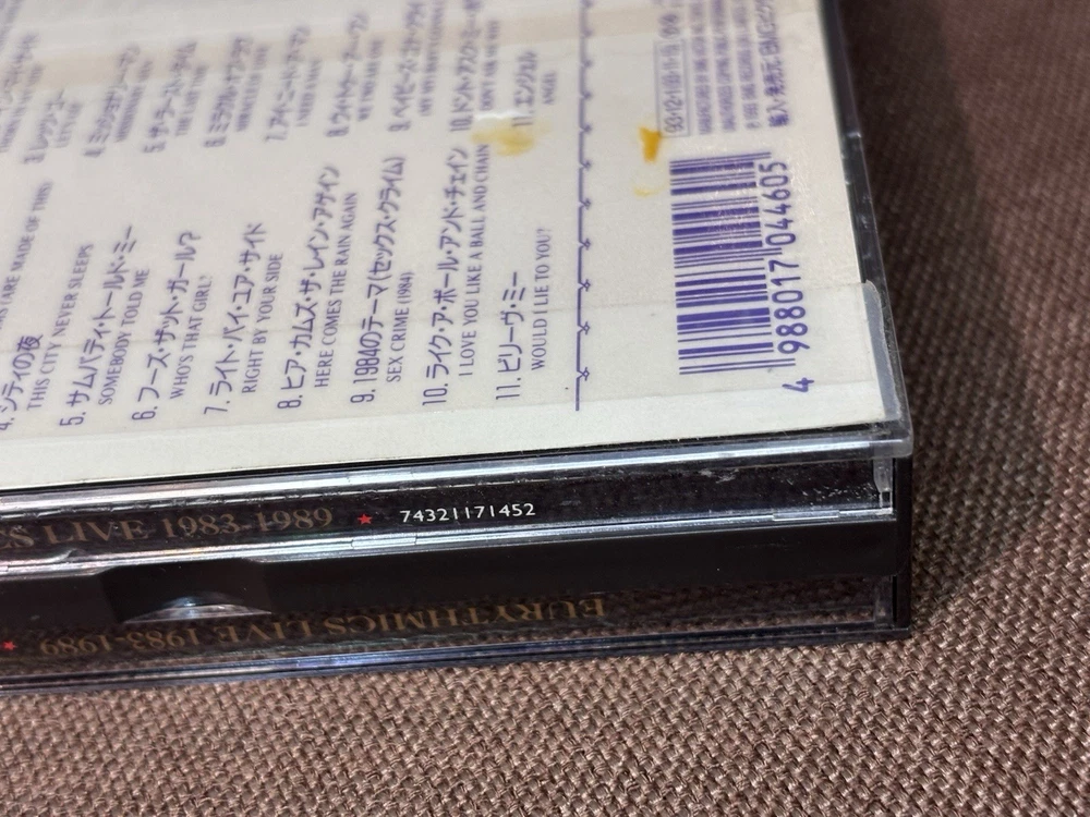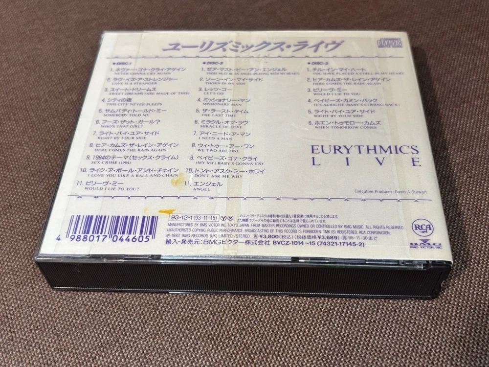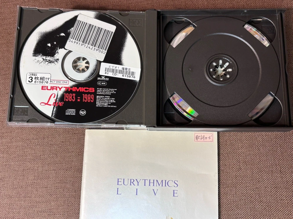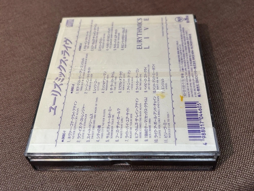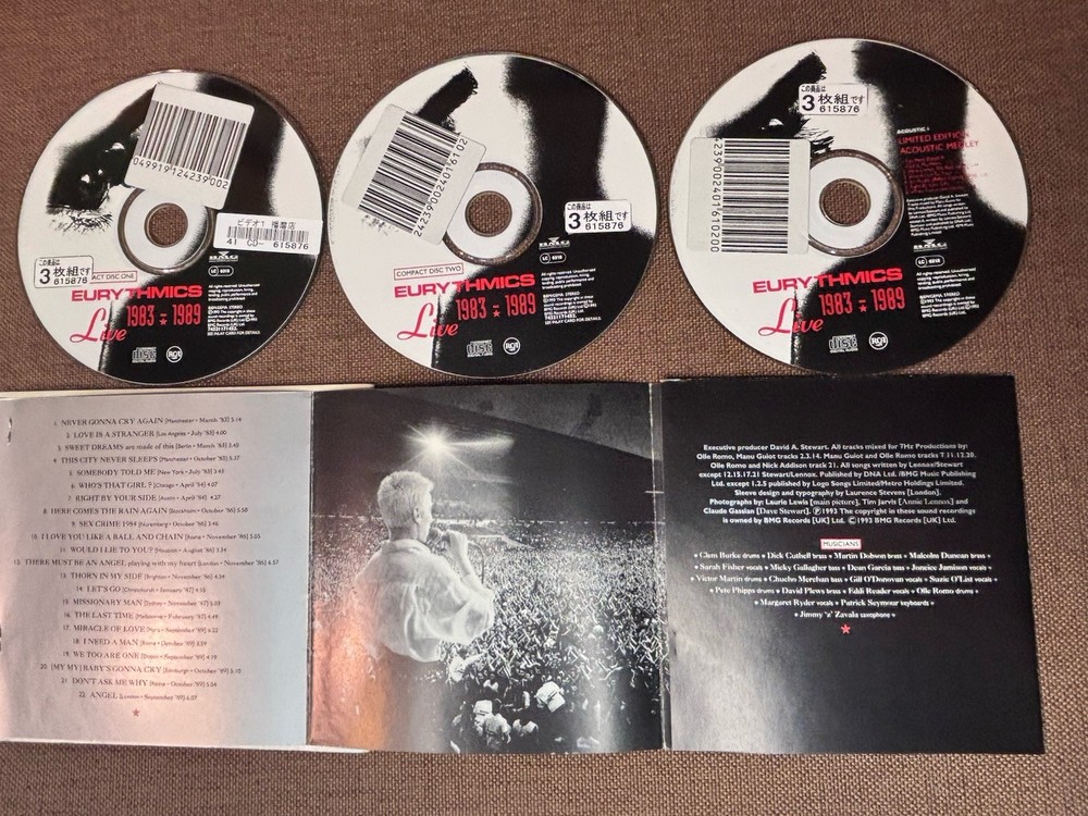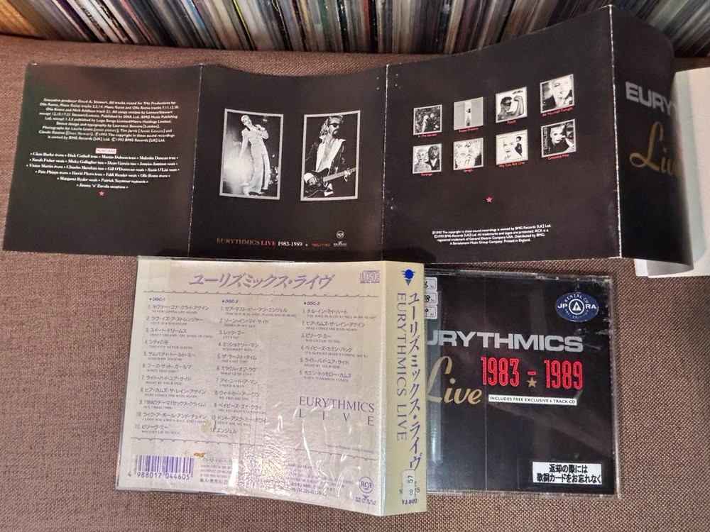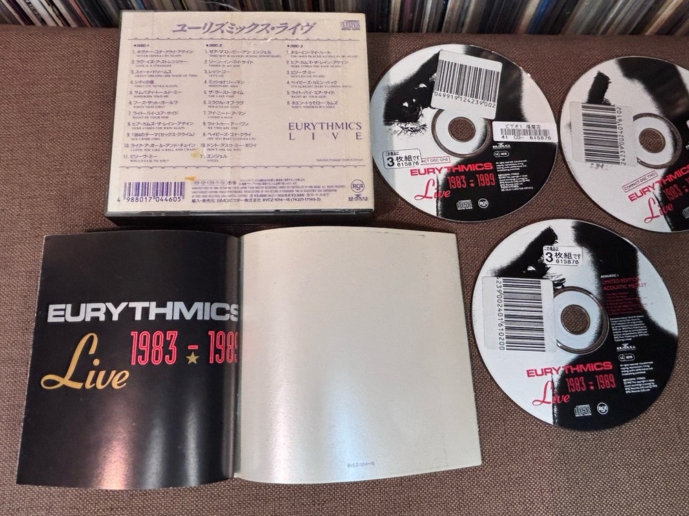 EURYTHMICS - Live 1983 - 1989 (1993) Annie Lennox JAPAN CD, 3 x CD (2CD + 1 BONUS CD), 1993 issue, former rental UK CD 74321171452 + Japanese OBI + 32-page Japanese BOOKLET w / OBI + Japanese B ooklet RCA/BMG VICTOR JAPAN BVCZ-1014~15 This is a RARE Japanese CD released from RCA/BMG VICTOR JAPAN in 1993. Cat. number: BVCZ-1014~15 ( RCA/BMG VICTOR JAPAN ) This is not a bootleg, we sell 100% genuine official items only. Import duties, taxes and charges are not included in the item price or shipping charges. These charges are the buyer’s responsibility. CONDITIONS PICTURE SLEEVE : VG-- (Stapled to booklet) CD : VG- (Rental stickers. Scratches, No skipping) JAPANESE BOOKLET : VG-- (Stapled to picture sleeve) OBI : VG-- (Laminated. Rental stickers. Stains.) G RADING Mint:Like new,no damages,just opened and never played Near Mint:Played several times, very light scuffs are visible Excellent:Few Slight Scratched,Scuffs,Slight Bit Folded(Stain) with the insert(OBI) Very Good:Polish Marks,Many Scratches,Large Split with the insert(OBI) Excellent does not mean "Like New", might have slight wear/or creasing. We don't grade company sleeve. FOR THE DETAILED CONDITIONS ,PLEASE EMAIL US or SEE THE PICTURES CAREFULLY BEFORE YOU BID. Track listings 1-1 Never Gonna Cry Again 5:14 1-2 Love Is A Stranger 4:00 1-3 Sweet Dreams (Are Made Of This) 3:45 1-4 This City Never Sleeps 5:37 1-5 Somebody Told Me 3:43 1-6 Who's That Girl? 4:07 1-7 Right By Your Side 4:27 1-8 Here Comes The Rain Again 5:50 1-9 Sex Crime (1984) 3:46 1-10 I Love You Like A Ball And Chain 5:05 1-11 Would I Lie To You? 3:34 2-1 There Must Be An Angel (Playing With My Heart) 6:57 2-2 Thorn In My Side 4:34 2-3 Let's Go 4:55 2-4 Missionary Man 5:03 2-5 The Last Time 4:49 2-6 Miracle Of Love 6:22 2-7 I Need A Man 3:59 2-8 We Too Are One 4:19 2-9 (My My) Baby's Gonna Cry 5:10 2-10 Don't Ask Me Why Mixed By – Nick Addison 5:04 2-11 Angel 6:07 Limited Edition Acoustic Medley 3-1 You Have Placed A Chill In My Heart 3:59 3-2 Here Comes The Rain Again 2:46 3-3 Would I Lie To You? 2:05 3-4 It's Alright (Baby's Coming Back) 1:30 3-5 Right By Your Side 1:22 3-6 When Tomorrow Comes SHIPPING SHIPPING IS FREE! TO ALL OVER THE WORLD via registered AIR with tracking No extra shipping needed when you buy additional FREE SHIPPING items ・Import duties, taxes and charges are not included in the item price or shipping charges. These charges are the buyer’s responsibility. ・Please check with your country’s customs office to determine what these additional costs will be prior to bidding/buying. COMBINED SHIPPING No extra shipping needed when you buy additional FREE SHIPPING items PAYMENT Payment should be completed within 72 hours. OTHERS Import duties, taxes and charges are not included in the item price or shipping charges. These charges are the buyer’s responsibility. These charges are normally collected by the delivering freight (shipping) company or when you pick the item up - do not confuse them for additional shipping charges. We ship items ONLY to your ebay registered shipping address.