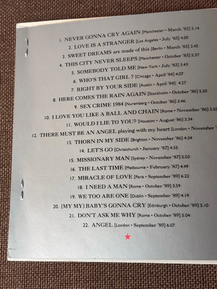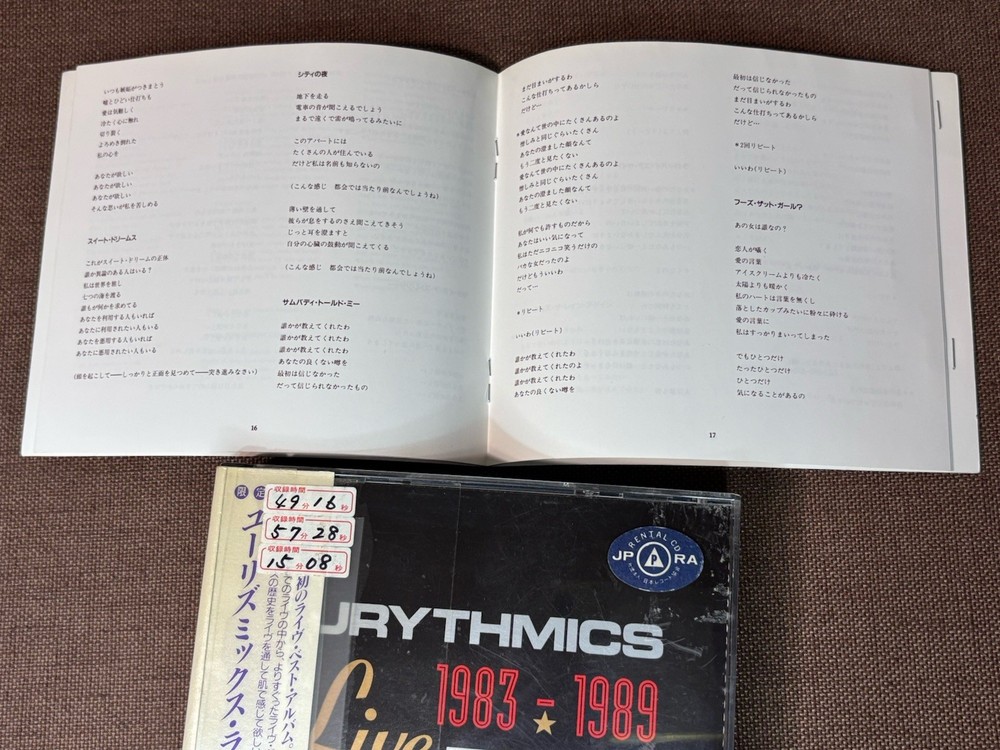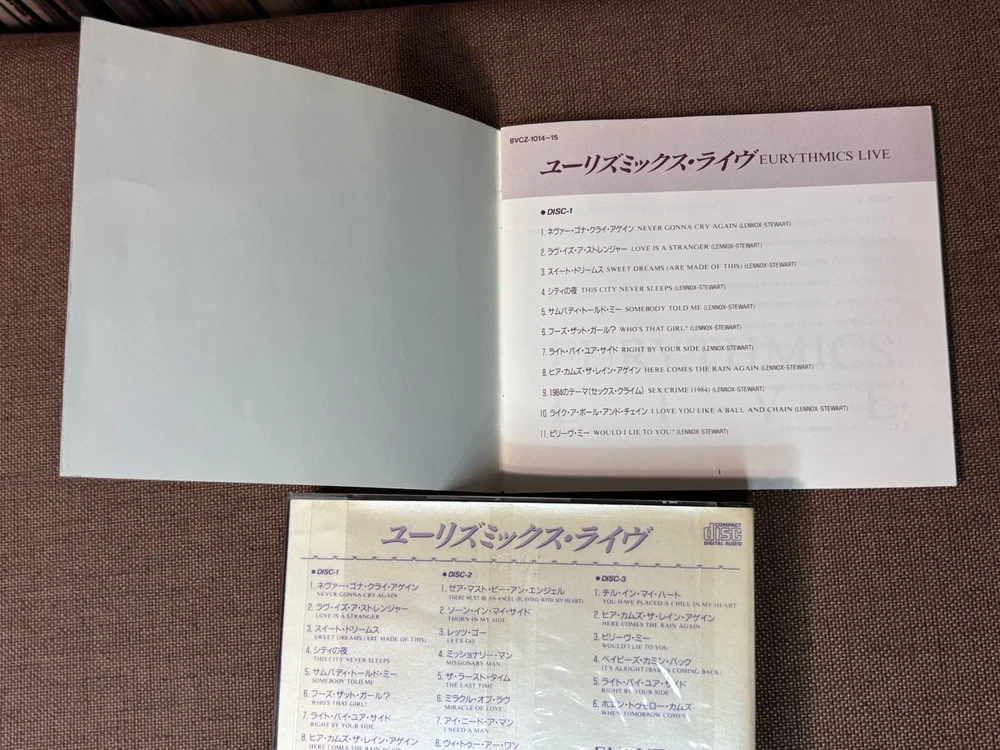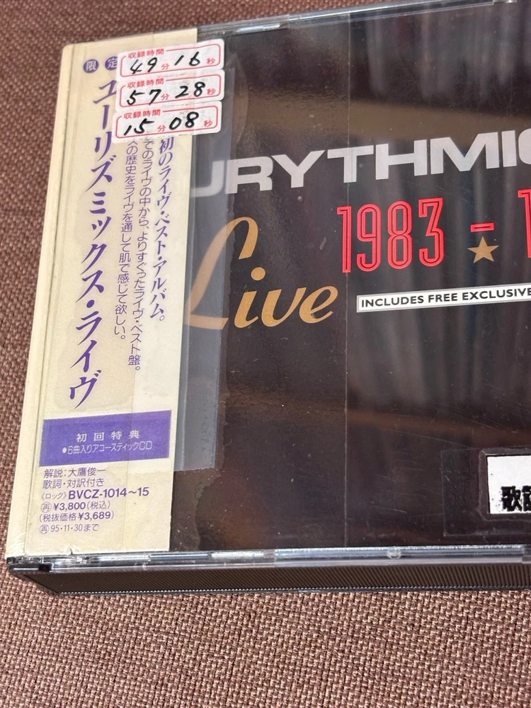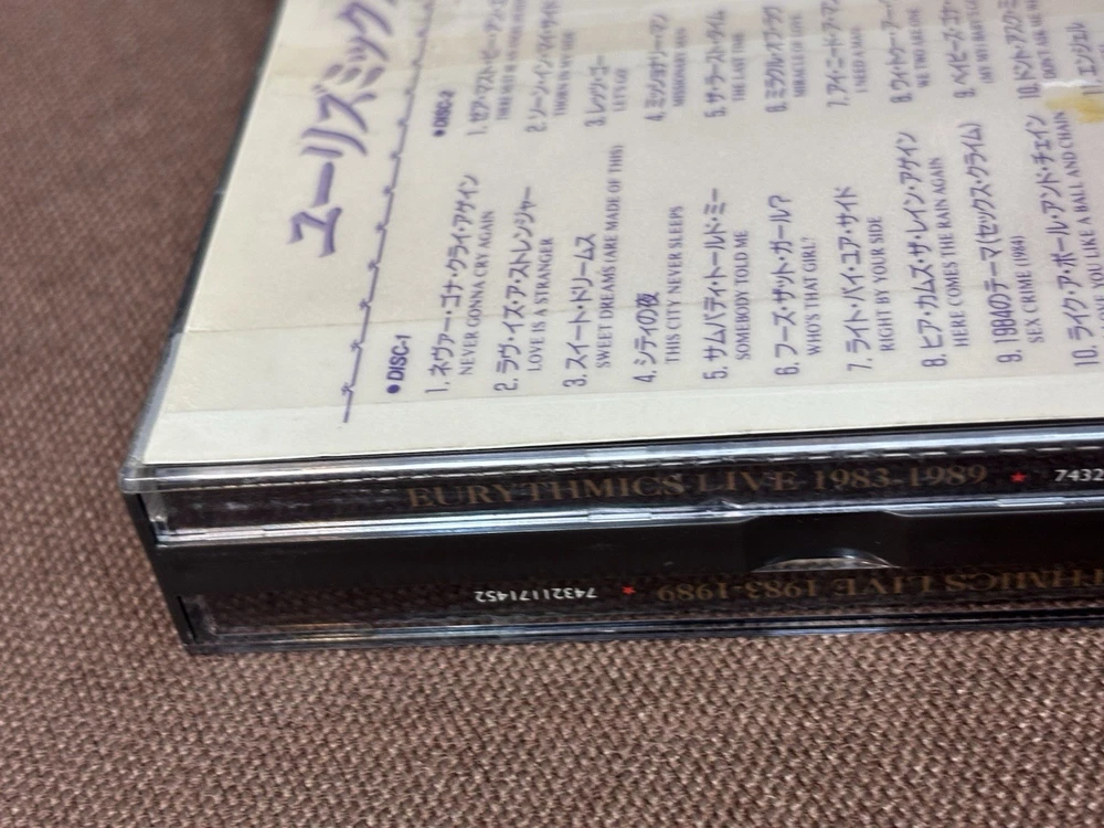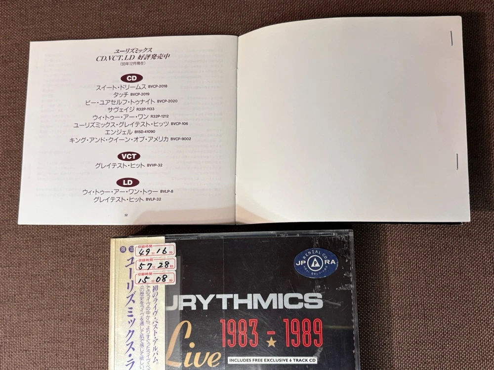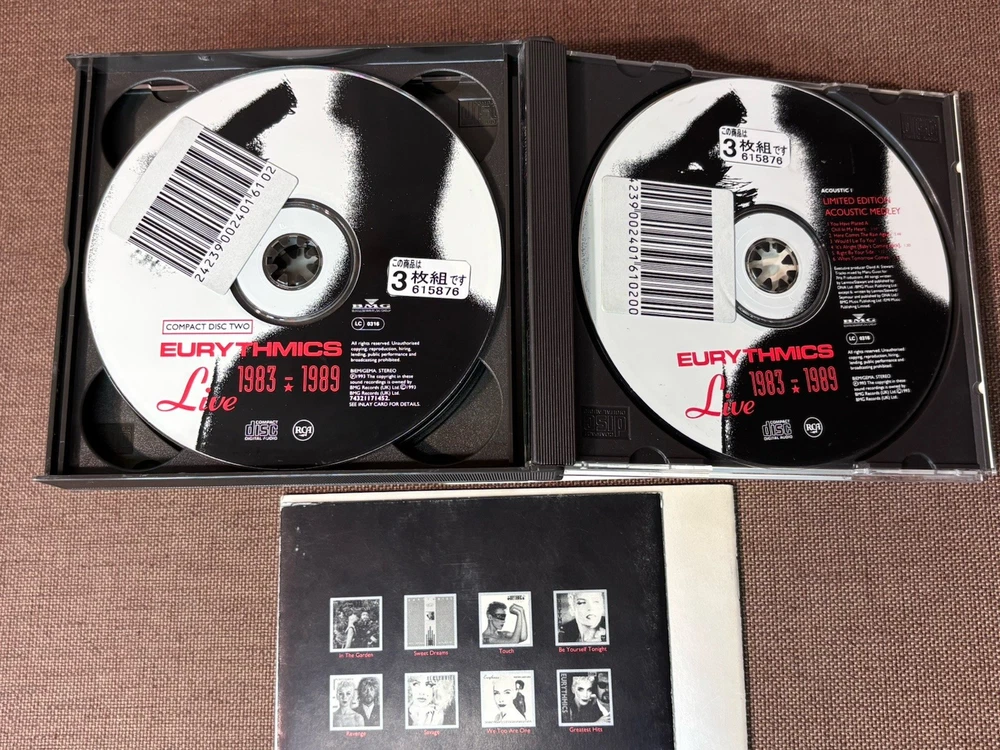 EURYTHMICS - Live 1983 - 1989 (1993) Annie Lennox JAPAN CD, 3 x CD (2CD + 1 BONUS CD), 1993 issue, former rental UK CD 74321171452 + Japanese OBI + 32-page Japanese BOOKLET w / OBI + Japanese B ooklet RCA/BMG VICTOR JAPAN BVCZ-1014~15 This is a RARE Japanese CD released from RCA/BMG VICTOR JAPAN in 1993. Cat. number: BVCZ-1014~15 ( RCA/BMG VICTOR JAPAN ) This is not a bootleg, we sell 100% genuine official items only. Import duties, taxes and charges are not included in the item price or shipping charges. These charges are the buyer’s responsibility. CONDITIONS PICTURE SLEEVE : VG-- (Stapled to booklet) CD : VG- (Rental stickers. Scratches, No skipping) JAPANESE BOOKLET : VG-- (Stapled to picture sleeve) OBI : VG-- (Laminated. Rental stickers. Stains.) G RADING Mint:Like new,no damages,just opened and never played Near Mint:Played several times, very light scuffs are visible Excellent:Few Slight Scratched,Scuffs,Slight Bit Folded(Stain) with the insert(OBI) Very Good:Polish Marks,Many Scratches,Large Split with the insert(OBI) Excellent does not mean "Like New", might have slight wear/or creasing. We don't grade company sleeve. FOR THE DETAILED CONDITIONS ,PLEASE EMAIL US or SEE THE PICTURES CAREFULLY BEFORE YOU BID. Track listings 1-1 Never Gonna Cry Again 5:14 1-2 Love Is A Stranger 4:00 1-3 Sweet Dreams (Are Made Of This) 3:45 1-4 This City Never Sleeps 5:37 1-5 Somebody Told Me 3:43 1-6 Who's That Girl? 4:07 1-7 Right By Your Side 4:27 1-8 Here Comes The Rain Again 5:50 1-9 Sex Crime (1984) 3:46 1-10 I Love You Like A Ball And Chain 5:05 1-11 Would I Lie To You? 3:34 2-1 There Must Be An Angel (Playing With My Heart) 6:57 2-2 Thorn In My Side 4:34 2-3 Let's Go 4:55 2-4 Missionary Man 5:03 2-5 The Last Time 4:49 2-6 Miracle Of Love 6:22 2-7 I Need A Man 3:59 2-8 We Too Are One 4:19 2-9 (My My) Baby's Gonna Cry 5:10 2-10 Don't Ask Me Why Mixed By – Nick Addison 5:04 2-11 Angel 6:07 Limited Edition Acoustic Medley 3-1 You Have Placed A Chill In My Heart 3:59 3-2 Here Comes The Rain Again 2:46 3-3 Would I Lie To You? 2:05 3-4 It's Alright (Baby's Coming Back) 1:30 3-5 Right By Your Side 1:22 3-6 When Tomorrow Comes SHIPPING SHIPPING IS FREE! TO ALL OVER THE WORLD via registered AIR with tracking No extra shipping needed when you buy additional FREE SHIPPING items ・Import duties, taxes and charges are not included in the item price or shipping charges. These charges are the buyer’s responsibility. ・Please check with your country’s customs office to determine what these additional costs will be prior to bidding/buying. COMBINED SHIPPING No extra shipping needed when you buy additional FREE SHIPPING items PAYMENT Payment should be completed within 72 hours. OTHERS Import duties, taxes and charges are not included in the item price or shipping charges. These charges are the buyer’s responsibility. These charges are normally collected by the delivering freight (shipping) company or when you pick the item up - do not confuse them for additional shipping charges. We ship items ONLY to your ebay registered shipping address.