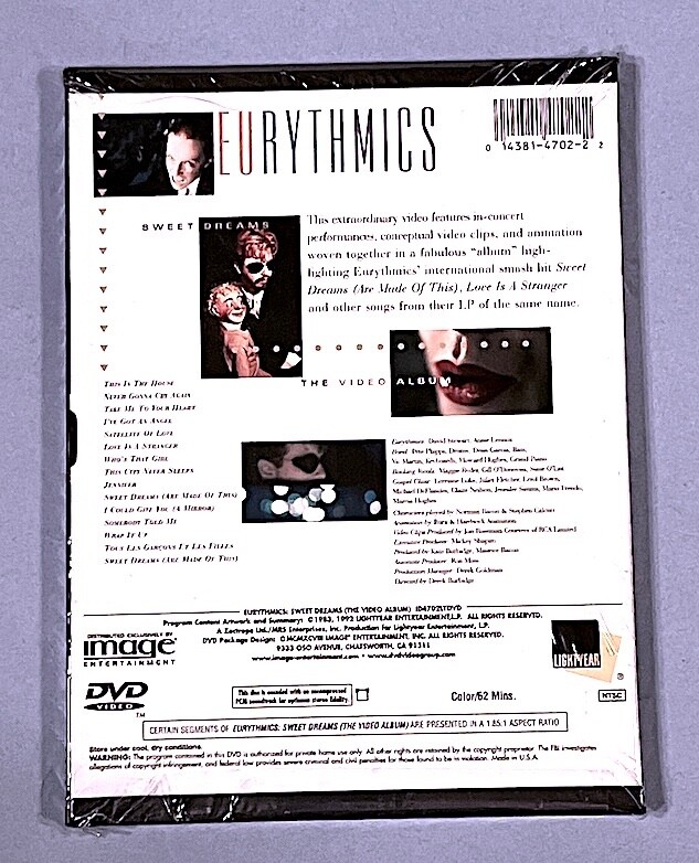 Brand NEW EURYTHMICS SWEET DREAMS Collection Annie Lennox, Dave Stewart DVD “D & A” (Dave and Annie) A stunning collection of their early hits, including: — SWEET DREAMS (Are Made of This) — WHO’S THAT GIRL — LOVE IS A STRANGER — WRAP IT UP — SATELLITE OF LOVE — I’VE GOT AN ANGEL — THE CITY THAT NEVER SLEEPS — plus Seven More! Absolutely brand new and sealed Please Note: DVD Discs are Region 1 for USA Returns accepted if unopened