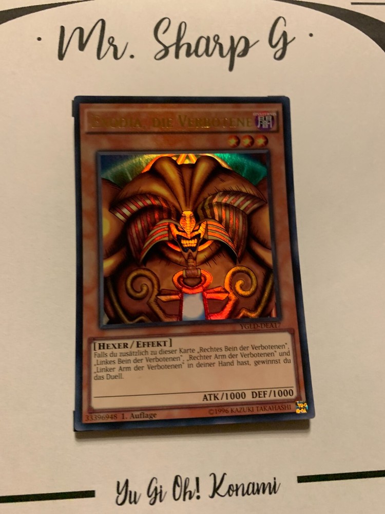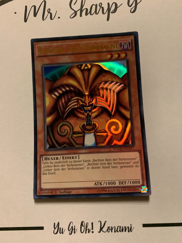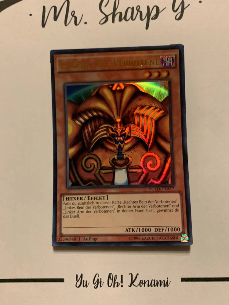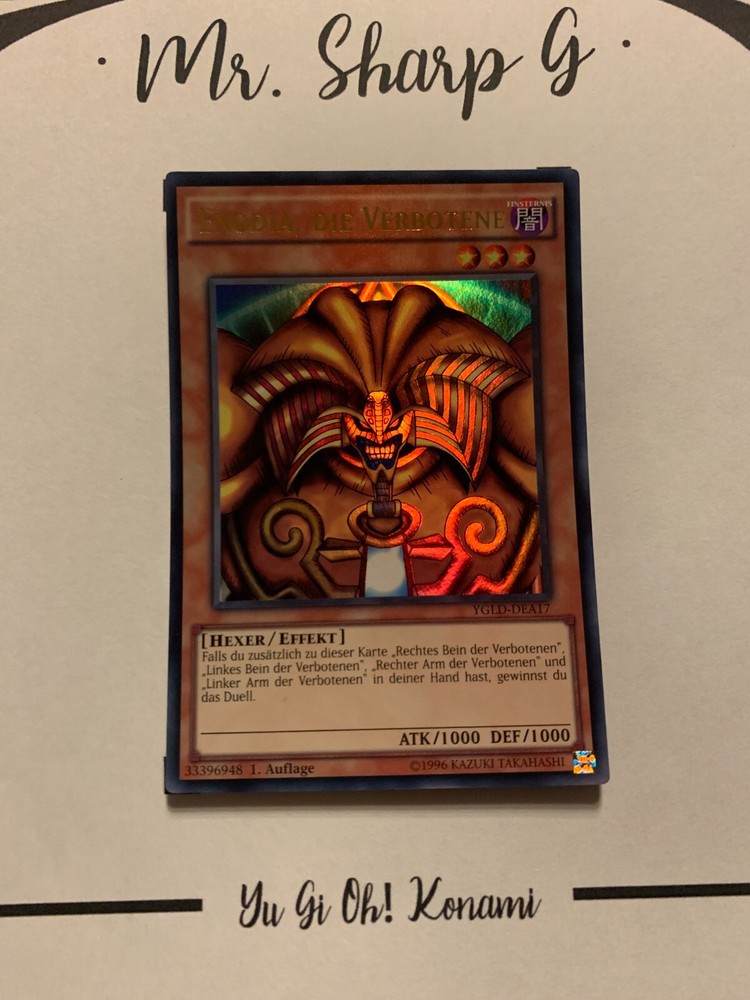- Mr. Sharp G - - Online Store - TRADING CARDS-TCG-COLLECTION-SETS-TOURNAMENT-Yu Gi Oh! Konami * * * EXODIA, DIE VERBOTENE - 1. AUFLAGE YGLD-DEA17 - Bitte schauen Sie sich die beigefügten Bilder an, um einen vollständigen Überblick über den Zustand jedes Artikels zu erhalten. - Zustand des Artikels: Neu* - in einem neuwertigem Zustand. (* Neuer Zustand - kann aber leichte Mängel wie 'whitening', leichte Eindrücke, Dellen u.a. haben - die von der Herstellung der Karte aus Produktion stammen, bitte den Bildern und in der Beschreibung den Zustand entgegennehmen) - Typ/ Serie: HEXER/ EFFEKT / 1. AUFLAGE YGLD-DEA17 - Seltenheitsstufe/ Rarity: ULTRA RARE - Edition : YUGI'S LEGENDARY DECKS / 2015 * * * + Kartenschutzhülle & Toploader inklusiver im Preis + mehrfache Bestellung = einmalige Versandkosten + versicherter Versand Bestellung in Höhe - v. 8,50EUR in Deutschland/ Inland - v. 12,50EUR im Ausland/ International + Großbestellungen kostenloser Versand Inland und International - Bei Fragen, Details, nicht im Bestand gewünschte Karten/ Artikel oder Versandgutschriften schreiben Sie uns! Wir freuen uns auf Ihre Nachricht! - Vielen Dank für Ihr Vertrauen, Unterstützung und Besuch in unserem Store ! - Ihr Mr. Sharp G Team