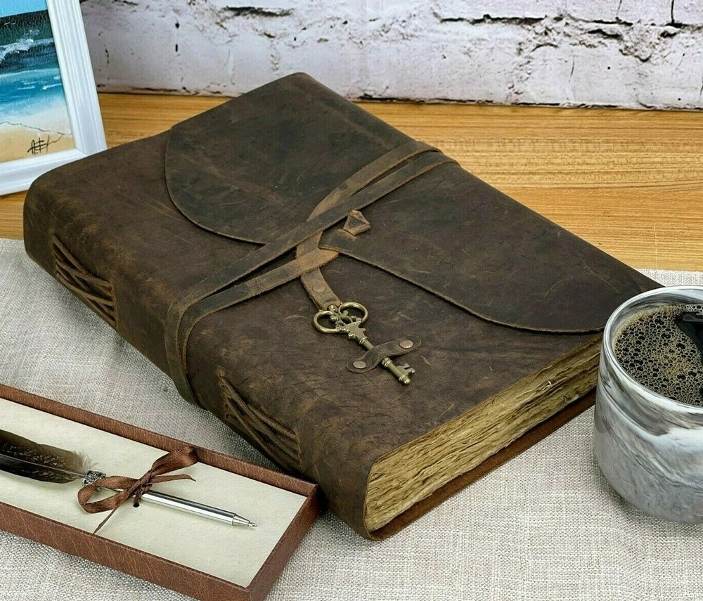 EXTRA LARGE 12x9" Vintage Leather Journal 400 Handmade Deckle Edge Pages Product Dimensions: 12 x 9 x 3 inches (400 pages) Unique Handmade Deckle Edged Vintage Paper which looks like it was pulled from history A Beautiful Rustic Brown Leather Journal of the Highest Quality Entirely handcrafted by artisans, each leather bound journal is a work of art. We use a thicker, higher grade leather combined with incredible craftsmanship to create a journal that is soft and supple in the hand with that fabulous, intense leather scent. The natural color variations make each journal unique. You will be as proud to own your vintage journal as we have been to make it! The paper is acid-free and pH neutral therefore is a timeless piece of art. A Beautiful Leather Journal of the Highest Quality Option : Feather ballpoint pen with black ink. Made from natural Pheasant feather. The perfect gift: You will find excellent packaging, exquisite design, antique style. Powerful eBay listing templates by 3Dsellers