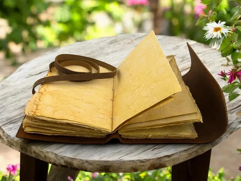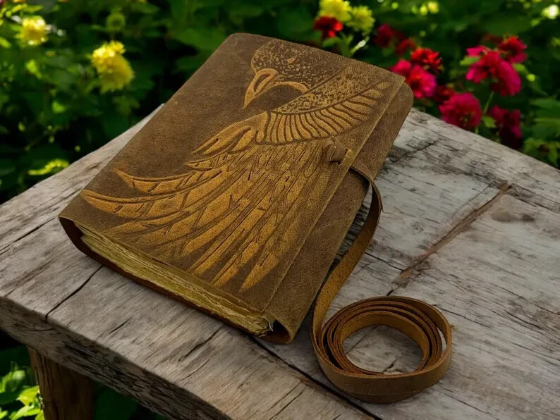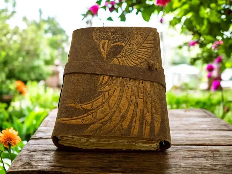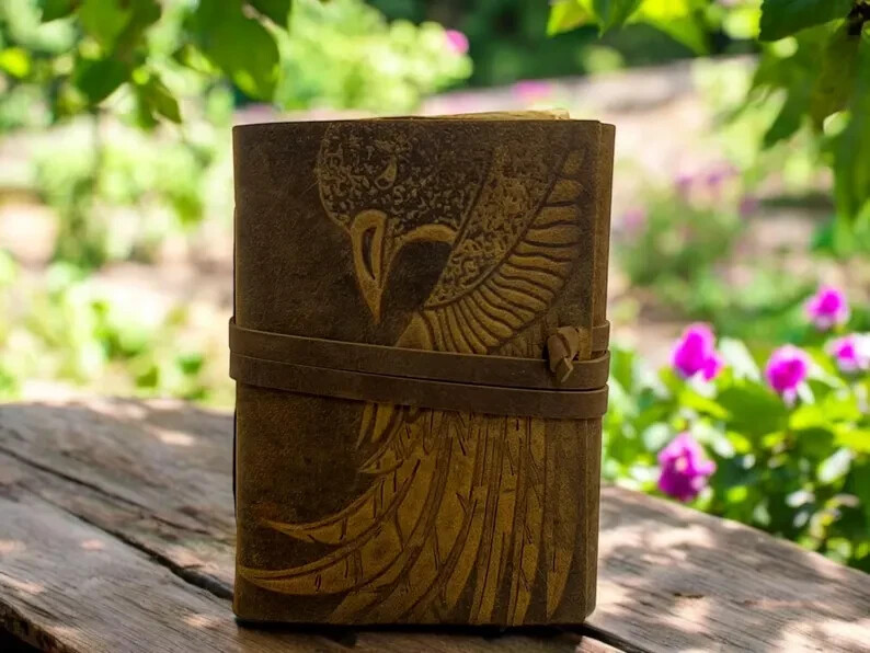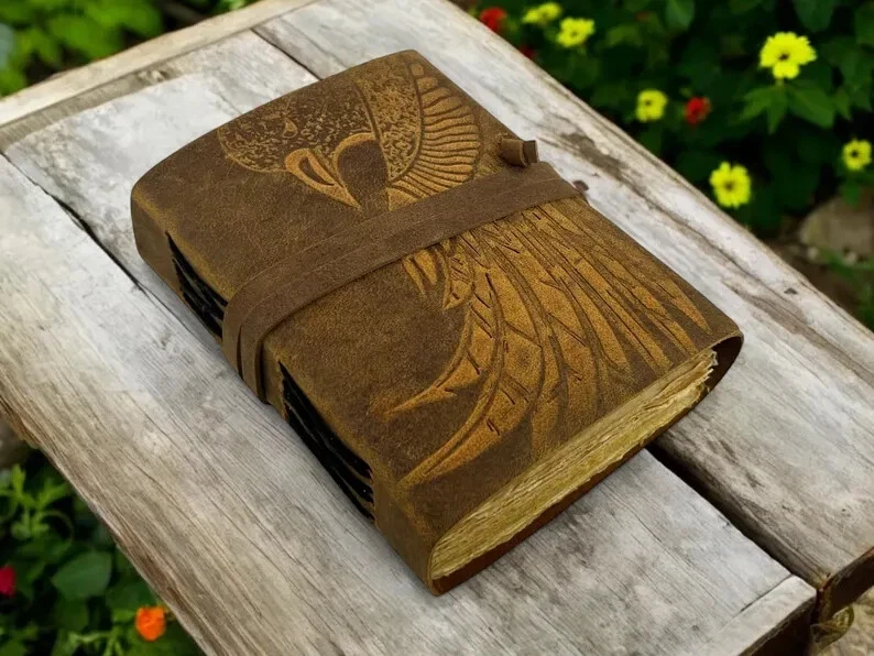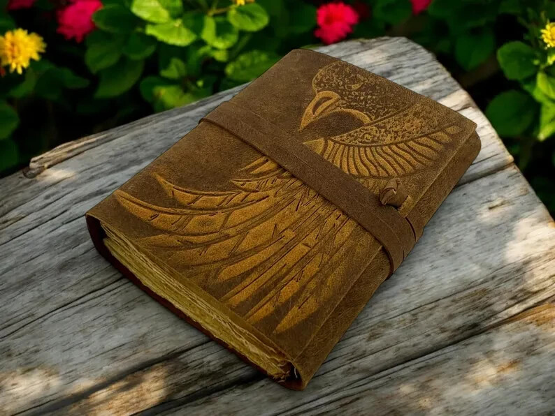 Handmade Eagle Embossed Leather Journal Blank Spell book of shadows - Vintage Travel Journal Junk Journal for him and her • full grain leather • Vintage deckle edge old paper • handmade rustic cotton paper • 100 Sheet (200 pages both side) • Available in 7x5 inches 8x6 inches 10x7 inches NOTE* - Leather Color slightly vary from the images - Leather journal witchcraft book of shadows notebook is made with 200 pages of Antique Paper which looks like it was pulled from history. You will fall in love with the the antique handmade cotton paper which is unique to our Vintage Journal Notebook. ● will keep all your valuable writing locked inside.Sturdy hand stitched binding to make sure that no paper comes out loose from your spell notebook. ● The witchcraft supplies journal is printed with a special seven stone called “Chakra healing” which helps to reveal inner truth within yourself and encourage self-awareness and self expression. We have taken extra to make sure that the emboss is perfect in every piece. ● Sketch, Doodle, Write on your Leather Blank Spell Journal with a Calligraphy Pen Fountain Pen, Brush Pen, Ball Pen, Acrylic Colours, Watercolor and many more. We guarantee no bleed through. ● Can be used as a notepad, journal, writing notebook, sketch book. 1.25 inch thickness, easy for handwriting, drawing or sketching and compact for carrying in your bag. Ideal for alternative ● Artist Sketchbooks, Photo Album, Traveling Notes, Business Executive, Logbook, Poetry Work, Journalists, Food Planner, Instagram Scrapbook and Bible Journaling. ● Best Gift For Your Companion: A Journal Is Like A Trusted Friend. You Can Use It To Solve Queries, Get Inventive, Or Record Valuable Memories For Them To Last Forever Or You Can Just Use It As A Gift For Your Wife, Son, Or A Daughter Or For Some Enthusiastic Writer In Your Family. Even For Looking For A Miraculous Spell Book Or A D&D Gamer Looking For His Quest Book. ● Perfectly Sized For Multi-Purpose Use: Length 5", Width 1", Height 7" Inches, This Easy To Carry Personal Diary Is Perfect To Use As A Health Journal, Sketchbook, And Poetry Journal. It’S An Ideal Journal Which Records Your Daily Thoughts And Life Lists. And Also Good For Designing, Doodling, Or Calligraphy Of Your Choice. Handmade journal, Blank Books, vintage diary, Genuine Leather Journal, Anniversary gift, Gifts for her, Personalized , Gifts for him, Valentines Gifts, a5 Journa PERFECT FOR ALL YOUR DAILY WRITING AND DRAWING NEEDS -- Junk Journal -- Dungeons and Dragons Journal - DND -- Mothers Day Gift -- Nature journaling -- Instagram photobook or scrapbook -- Teen journal or girls' diary -- Travel diary -- Weight Watchers Records -- New baby records or journal -- Letters to your loved ones -- Letters to give to your children when they grow up -- Daily Notepad or Bullet Journal -- Scheduling and appointment reminders -- Life moments tracker -- Vacation scrapbook -- Story writing -- Notebook to write in