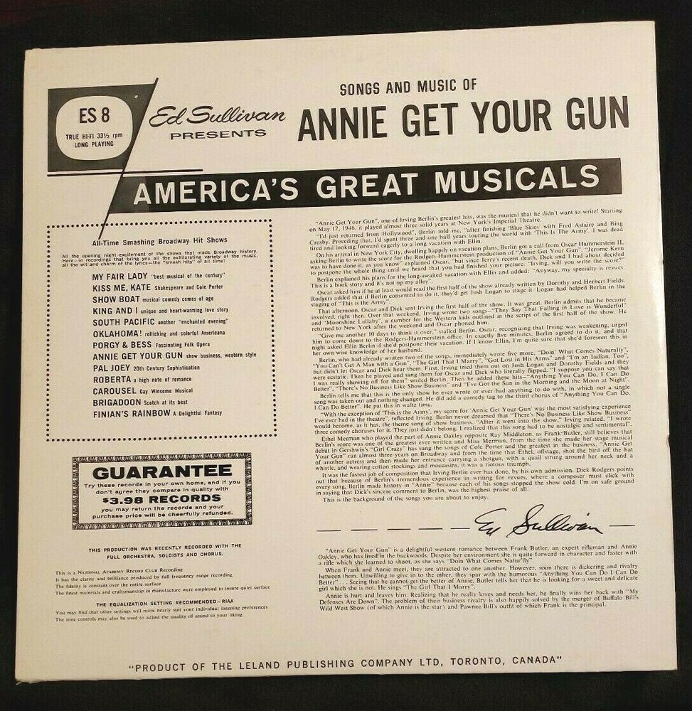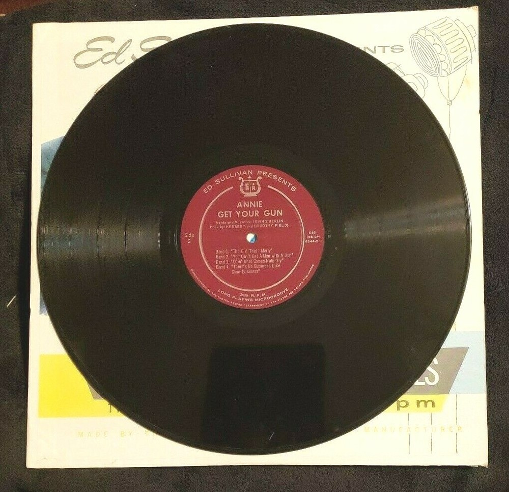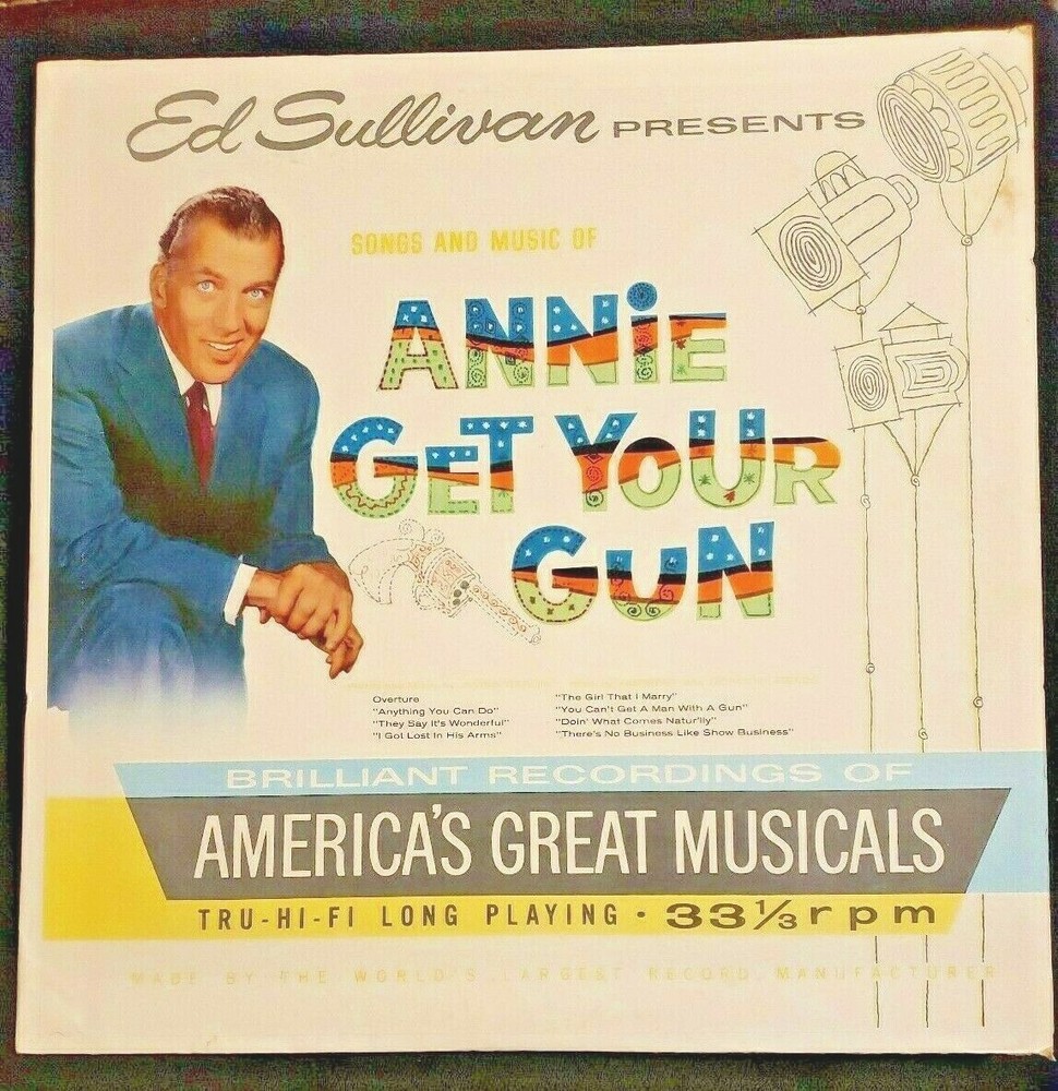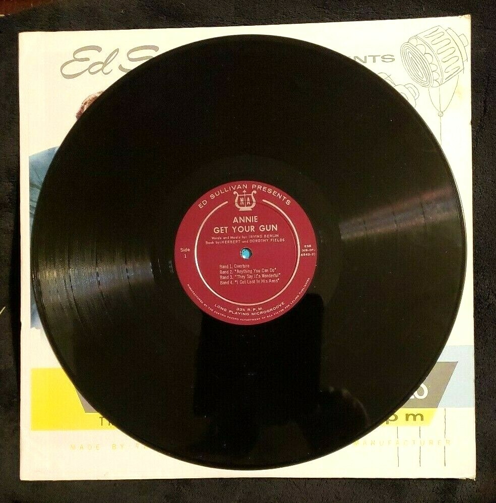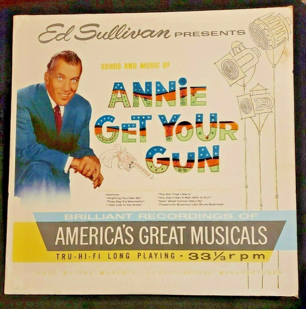 Item Description Vintage LP Vinyl Record Album Ed Sullivan Presents Songs and Music of ANNIE GET YOUR GUN Words and Music by Irving Berlin Book by Herbert and Dorothy Fields Side 1 Overture Anything You Can Do They Say It's Wonderful I Got Lost In His Arms Side 2 The Girl That I Marry You Can't Get A Man With A Gun Doin' What Comes Natur'lly There's No Business Like Show Business Product of Leland Publishing Company ES Record - Vinyl -- 'Very Good' condition -- no visible scratches on vinyl Jacket - Sleeve -- 'Very Good' condition -- light wear & tear Any Questions, please ask! thanks for looking ☺