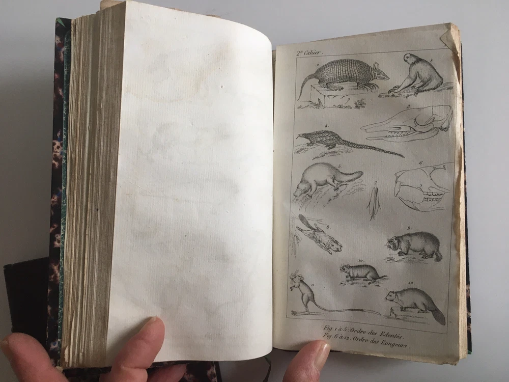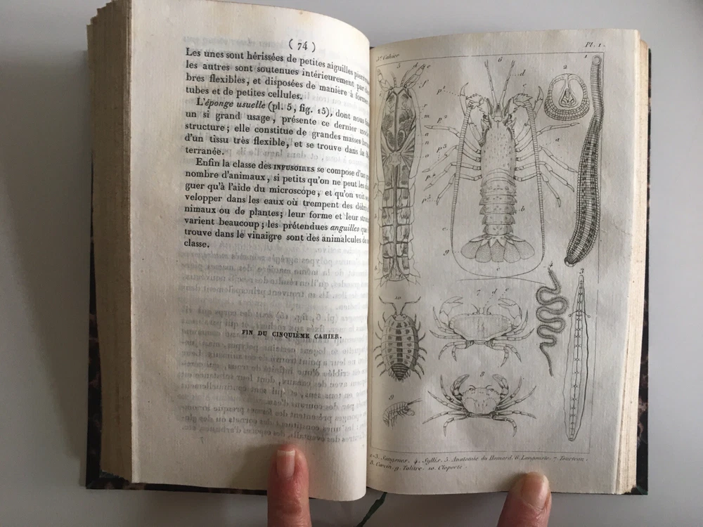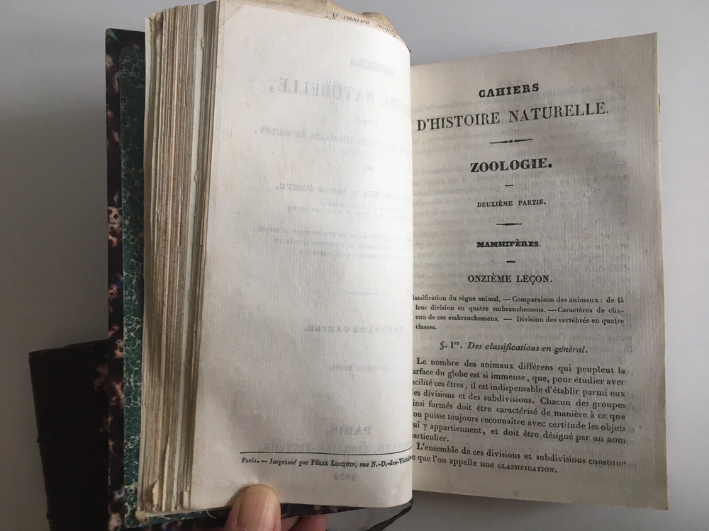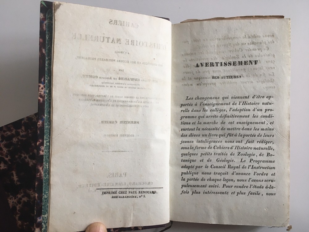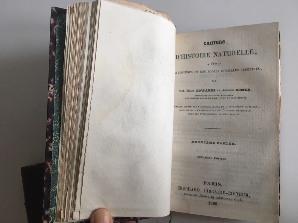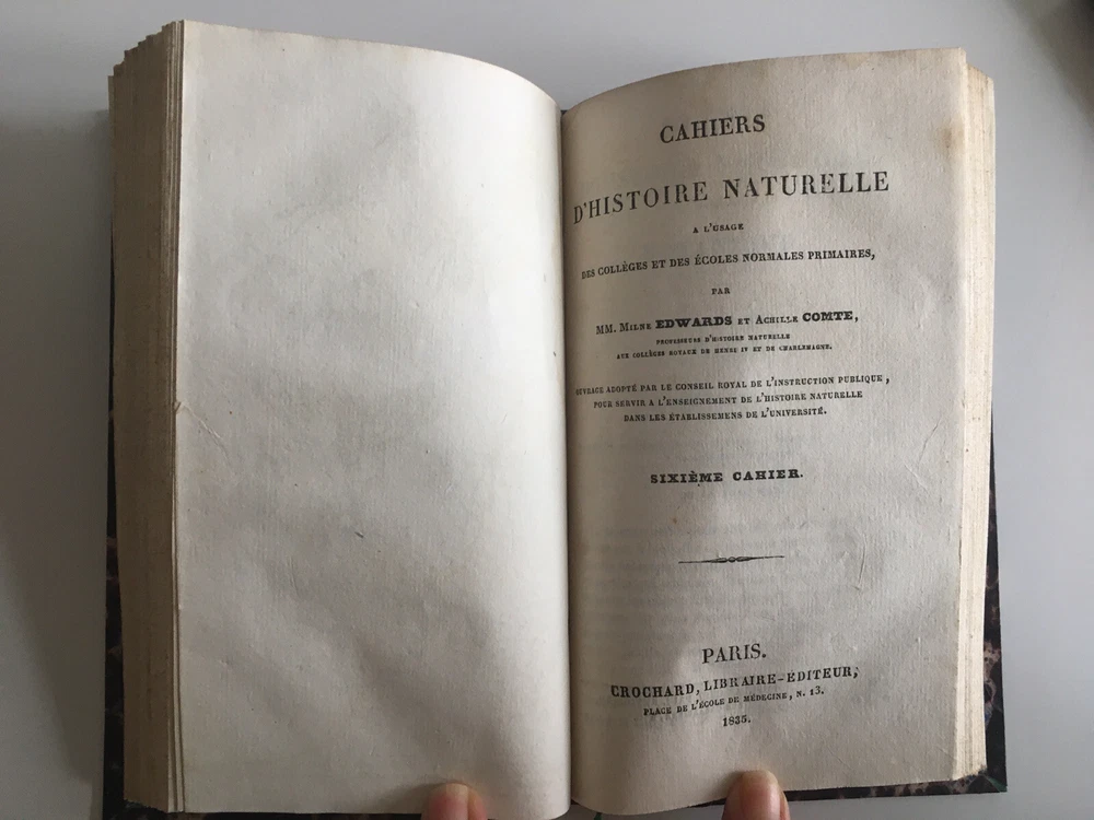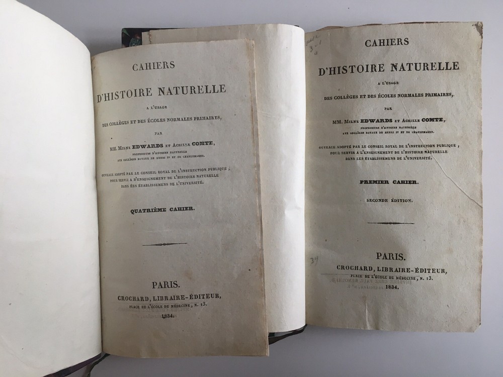 Natural history notebooks for the use of colleges and primary schools, by Milne Edwards and Achile Comte, 1st notebooks, second edition, Paris, Crochard - 1834. XII; 84 pp. 29 lessons, 6 plates. followed by, 2nd notebooks, second edition, Paris, Crochard - 1836. 142 pp. 6 plates. followed by, 3rd notebooks, Paris, Crochard - 1834. 106 pp. 6 plates. followed by, 4th notebooks, Paris, Crochard - 1834. VI, 88pp. 5 plates. followed by, 5th notebooks, Paris, Crochard - 1835. 74 pp. 5 plates. followed by, 6th notebooks, Paris, Crochard - 1835. 146 pp. 7 plates. Gathered in 2 volumes Leather back 17.5 x 10 cm. In very good condition. Natural history notebooks for the use of colleges and primary schools, by Milne Edwards and Achile Comte, 1st notebooks, second edition, Paris, Crochard - 1834. XII; 84 pp. 29 lessons, 6 plates. followed by, 2nd notebooks, second edition, Paris, Crochard - 1836. 142 pp. 6 plates. followed by, 3rd notebooks, Paris, Crochard - 1834. 106 pp. 6 plates. followed by, 4th notebooks, Paris, Crochard - 1834. VI, 88pp. 5 plates. followed by, 5th notebooks, Paris, Crochard - 1835. 74 pp. 5 plates. followed by, 6th notebooks, Paris, Crochard - 1835. 146 pp. 7 plates. Gathered in 2 volumes Leather back 17.5 x 10 cm. In very good condition.