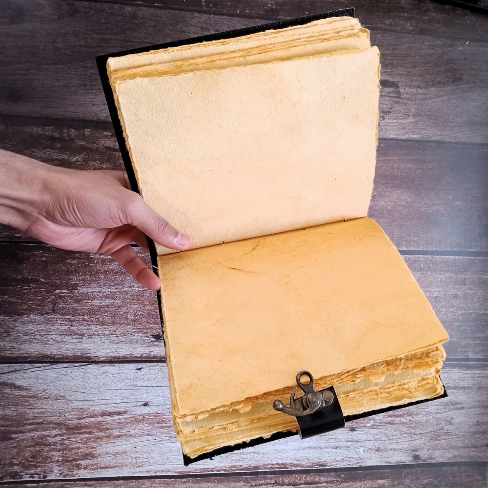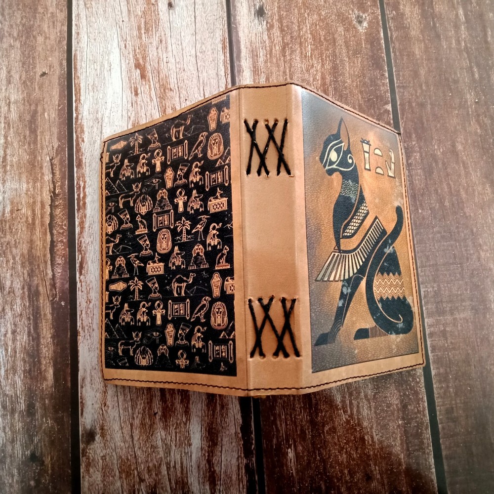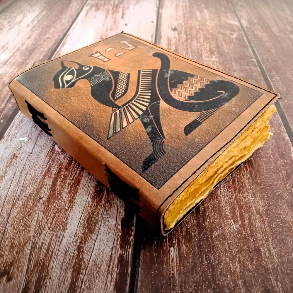 This Egyptian Cat Printed Leather Journal is a beautifully crafted handmade notebook perfect for capturing thoughts, dreams, sketches, & more. Made with premium leather, it features an intricate Egyptian cat design that adds a touch of elegance & mystique. Inside, you'll find 210 deckle-edged pages, enhancing its rustic appeal & making each page feel unique. This versatile journal is available in three sizes: 7x5 inches, 10x7 Inches 13x10 Inches. It's a personalized gift. option suitable for use as a dairy, sketchbook, or journal for any occasion.
