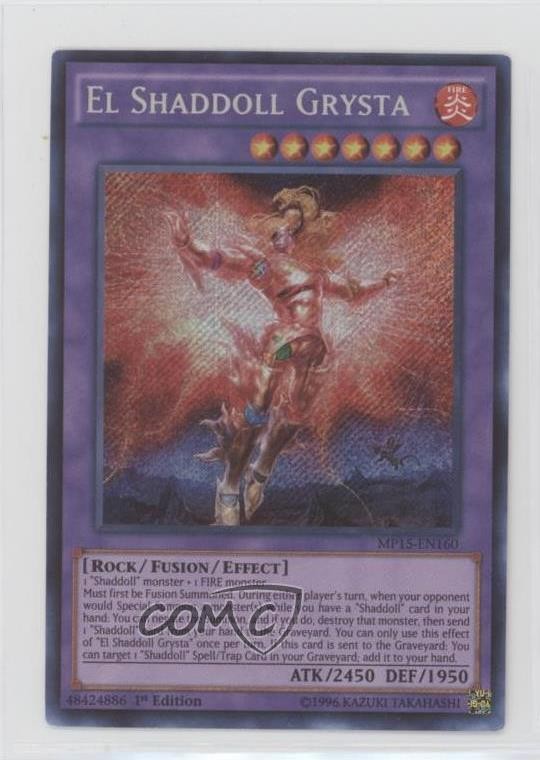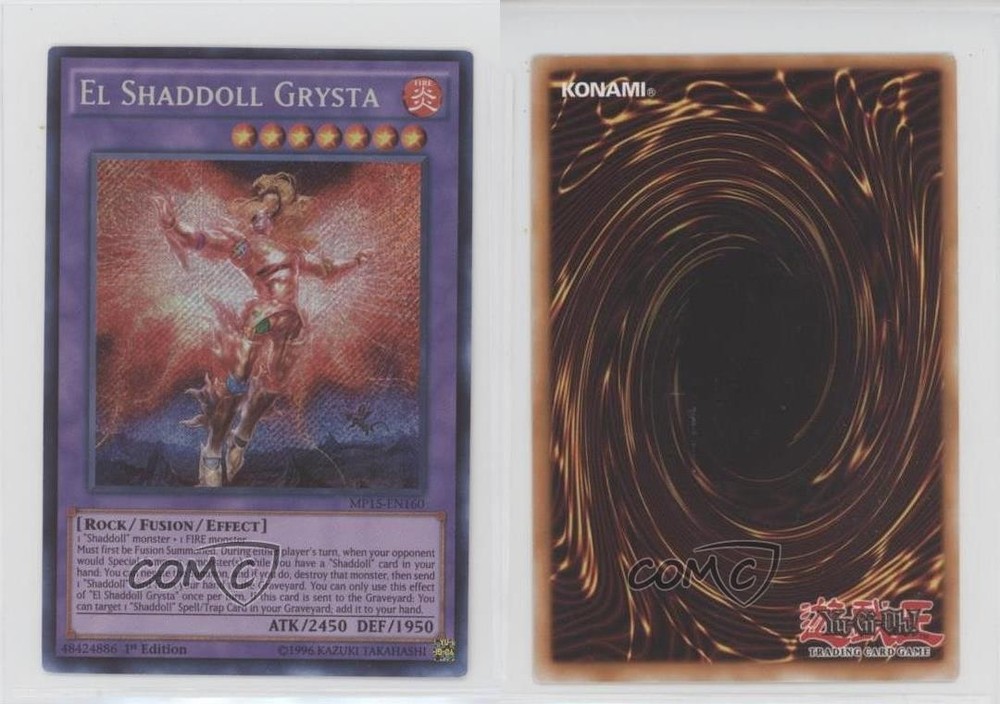 2015 Yu-Gi-Oh! Mega-Tins - Mega Pack [Base] - 1st Edition #MP15-EN160 El Shaddoll Grysta (SE) COMC Item: 106534373 - YuGiOh Card Search for more: 2015 Yu-Gi-Oh! Mega-Tins Search for more: 2015 Yu-Gi-Oh! Mega-Tins - Mega Pack [Base] - 1st Edition View all of our Listings Auctions Buy It Now About Us Located in the beautiful Pacific Northwest, COMC (Check Out My Cards) is the world's largest consignment service for trading card singles. More than 10,000 people have used our consignment service to list over 50 million trading cards. Find out how we can help you consign your items on eBay by contacting us through eBay messaging. COMC -- "The Safe & Easy Way to Buy & Sell" Raw Condition for Modern Cards Unless otherwise noted, raw modern cards are listed in Near Mint-Mint condition or better. A NM-MT card appears to be Mint at first glance, but upon closer inspection, may exhibit some of the following: minor print defects (e.g. roller marks, print line, dimple), minor scratches, slight edge wear, and slight corner wear. Centering is clearly visible in the images provided and does not factor into our condition assessment. Raw Condition for Vintage Cards Unless otherwise noted, raw vintage cards are listed in Excellent condition or better. An EX card may exhibit some of the following: minor rounding of corners, surface wear, print defects, light scratches, and slight edge wear/chipping. Centering is clearly visible in the images provided and does not factor into our condition assessment. Domestic Shipping Combined shipping for multiple items is available. To receive combined shipping, please ensure all desired items are in your eBay shopping cart before proceeding to checkout. eBay limits orders to 40 items per order. We automatically combine multiple orders placed on the same day. If you place multiple orders on the same day, please contact us to request a refund of applicable shipping costs. Signature confirmation may be required on invoices over $400. All cards are protected and shipped securely. International Shipping COMC offers eBay's International Shipping (EIS) for international orders under $2,500* (see country exceptions below). All duties and import fees are paid at checkout; in the rare event that there are additional import fees upon delivery, these are borne by the buyer. EIS packages route through a shipping hub in Erlanger, KY before shipping to their final destination. Please note that EIS does not allow for combined shipments. The shipping rates are determined by eBay and cannot be adjusted. *Maximum sale price exceptions: Colombia, Kuwait ($2,000); Taiwan ($1,539); Chile, Costa Rica, Guatemala, Honduras, Trinidad and Tobago ($1,000); Antigua and Barbuda, Aruba, Belize, Dominica, Grenada, Philippines, Saint Kitts and Nevis, Saint Lucia, Montserrat, Turks and Caicos Islands ($500); Dominican Republic, El Salvador ($200). Please request a shipping quote through eBay messaging for orders that exceed the maximum sale price supported by eBay's International Shipping. You will be responsible for all duties and import fees for international orders shipped outside the EIS. All cards are protected and shipped securely. Payment COMC does not accept offers on our cards through our eBay storefront. COMC utilizes eBay’s managed payments system. If you are experiencing difficulties making a payment, please contact eBay for assistance. Return Policy Returns are only accepted on the rare occasion the item is not as described. If you are making a return, please initiate the return process through eBay so a mailing label can be provided for you. Prior to listing, our expert team carefully assessed this item to represent it accurately. Please review the description and high-definition images prior to purchasing to ensure this item meets your satisfaction. We welcome you to contact us if you have further questions about this item. Trust and Integrity COMC carefully assesses each item consigned to us to prevent fraudulent items from entering the marketplace. If you believe an item offered on COMC may be fraudulent, please contact us with details so we can investigate the issue. Items we determine are outside our supported items policy may be removed. Last Modified: 6/4/2025 4:50:19 AM PDT