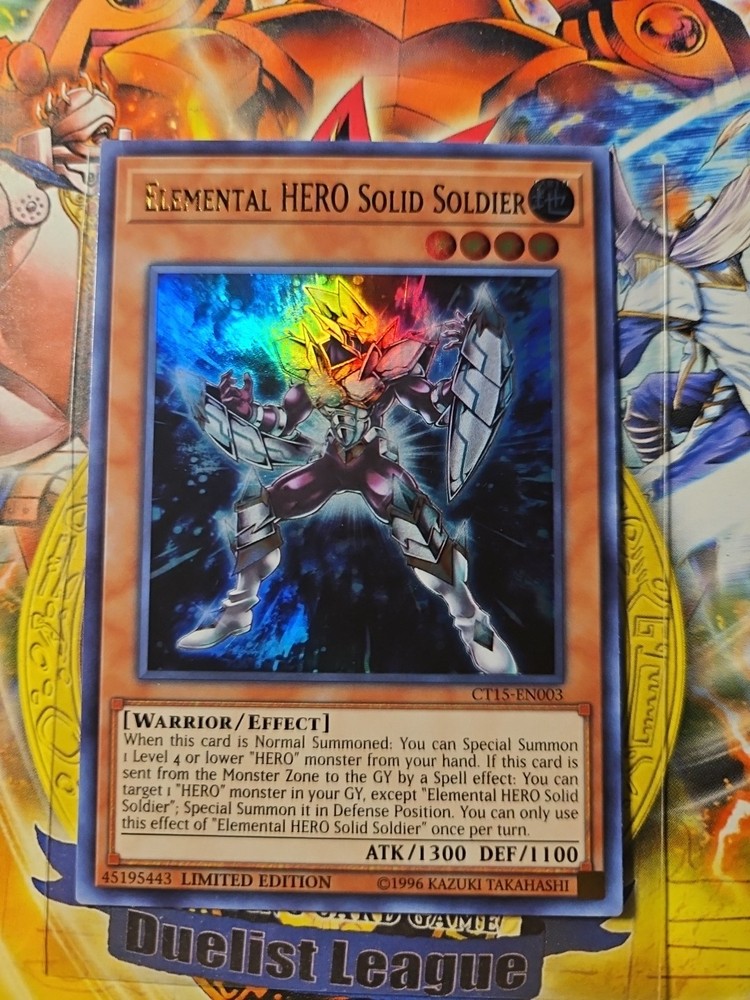 The "Elemental HERO Solid Soldier" card is a Warrior-type monster card from the 2018 Mega-Tins set in the Yu-Gi-Oh! TCG. It has an Attack/Power of 1300 and a Defense/Toughness of 1100, making it a formidable addition to a player's deck. This Ultra Rare card is in English and features limited edition artwork, adding to its collectible value. Manufactured by Konami, this card is a valuable find for collectors and players looking to enhance their decks with a powerful Earth attribute monster.