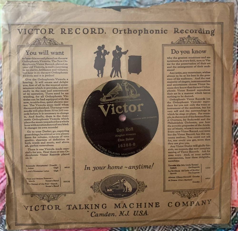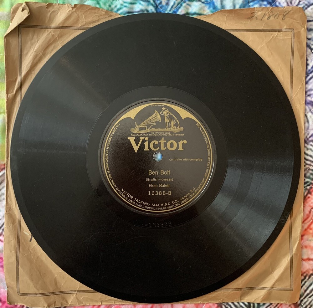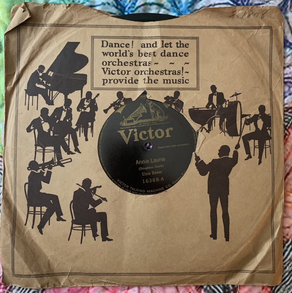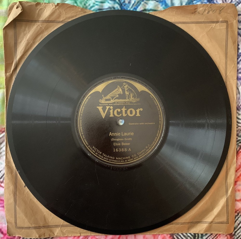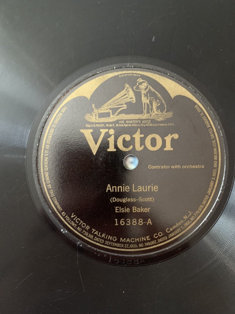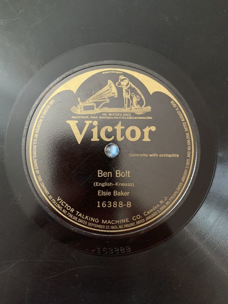 This 1910 Victor 16388-VG+ record features Elsie Baker singing "Annie Laurie" and "Ben Bolt" accompanied by an orchestra. The shellac material black record comes in its original Victor factory sleeve and is a first pressing. It has a record size of 10" and plays at 78rpm. The contralto with orchestra style is traditional and vocal, with a run time of a single. The record label, catalog number, and release year are included in the release information. The record grading is very good plus (VG+) and the inlay condition is very good (VG). This unit type is a single and is categorized under music and vinyl records. The language is English and the record is mono with high-fidelity. Please see all photos. Shipped with USPS Media Mail. Thanks.