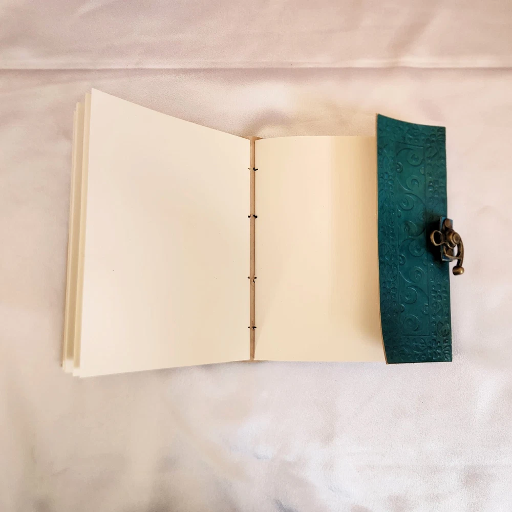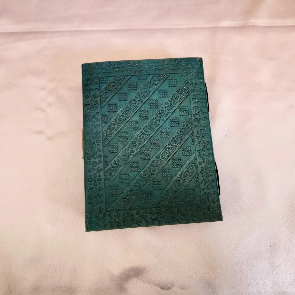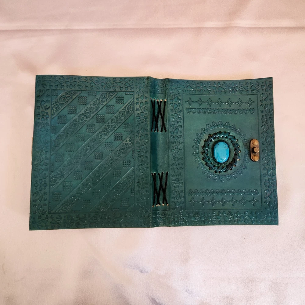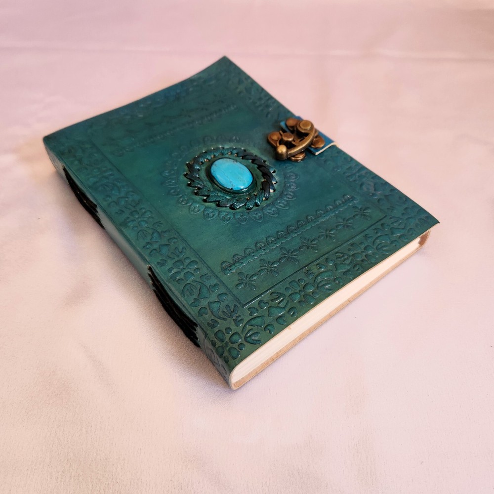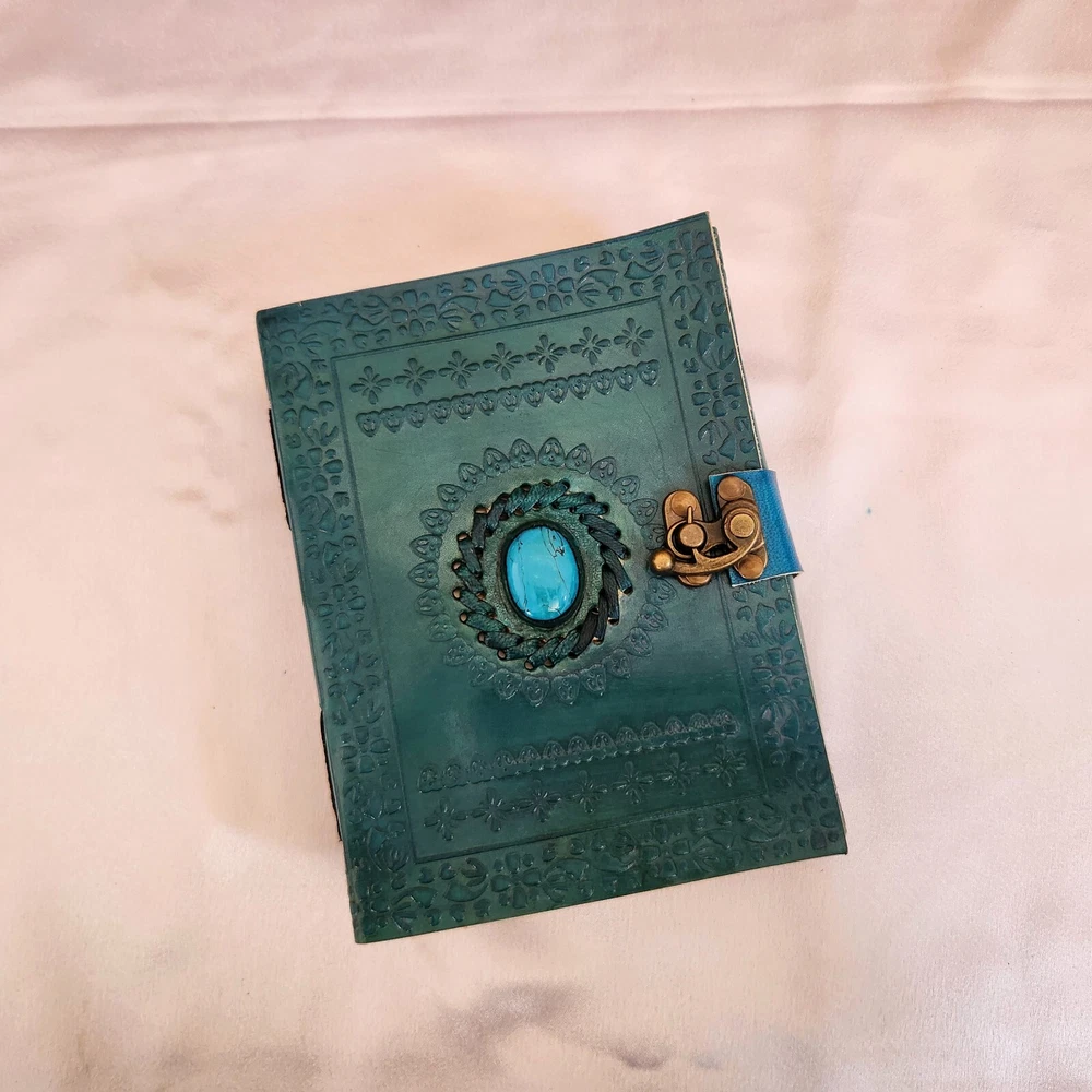 Embossed Leather Journal, with stone Notebook, Wedding gift, Wedding guest book, sketchbook, Dream journal, Leather Dairy, Personalized gift 1. Introducing our exquisite Embossed Leather Journal, a true masterpiece crafted with utmost precision and attention to detail. This stunning turquoise leather journal is adorned with a captivating turquoise stone, adding a touch of elegance and uniqueness to its design. 2. This versatile notebook serves multiple purposes, making it an ideal choice for various occasions. Whether you're looking for a wedding gift, a wedding guest book, a sketchbook, a dream journal, or a leather diary, this journal has got you covered. 3. With its 200 pages, there's ample space to pour your thoughts, ideas, and creativity onto its high-quality, acid-free paper. The embossed leather cover not only provides durability but also adds a touch of sophistication to this timeless piece. 4. What sets this journal apart is its ability to be personalized, making it an exceptional gift for your loved ones. Whether you choose to engrave a name, a special date, or a heartfelt message, this personalized touch will make it a cherished keepsake for years to come. 5. Indulge in the art of writing and capture your most precious memories with this turquoise leather journal. Its exquisite design, versatility, and personalized touch make it a perfect companion for any occasion, be it a wedding, a creative endeavor, or a personal journey.
