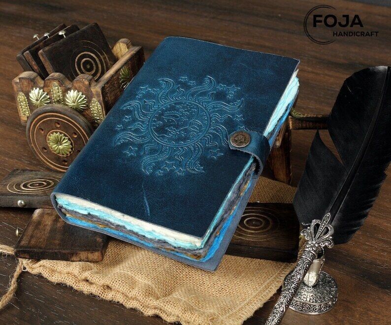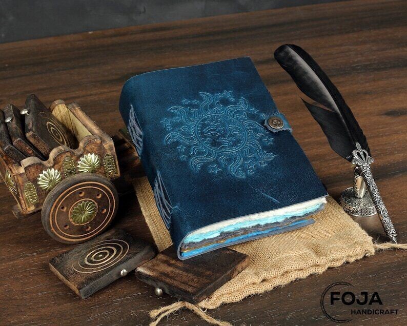 Handmade Deckle Edge Vintage Paper, Leather Sketchbook, Drawing Journal, Great Gift leather book of shadows journal blank spell notebook deckle edge paper wiccan sketchbook for women is very beautifully embossed and hand made notebook features a brown leather binding, with embossed design front Gift For Mother's Day The concept is found particularly in the tantric traditions of Hinduism, Buddhism and Jainism. They are conceived as an energy focal point, bodily functions or psychic node in the subtle body. The leather book is approximately 7 inches tall, 5 inches wide, and 1.2 inches thick, and the pages are unlined. Notebook has antiqued brass swing clasp to keep your secrets from prying eyes. The luxurious blue leather cover not only adds a touch of elegance but also ensures durability and longevity. Premium Quality: Artisanal Craftsmanship: Versatile use: Unlined Pages: Compact and Portable: Secure Closure: Unique Gift: