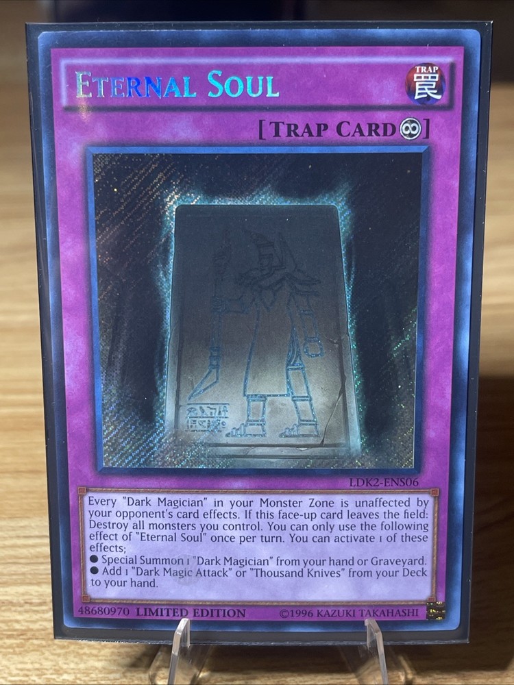 Elevate your Yu-Gi-Oh! TCG collection with the "Eternal Soul" card from the Legendary Decks II set. As a Secret Rare Trap-Normal card numbered LDK2-ENS06, it's a must-have for both serious collectors and competitive players. The card's allure lies not only in its limited edition status but also in the strategic depth it adds to your gameplay. Featuring the signature artwork that collectors and players alike have come to appreciate, this English-language card is produced by Konami, ensuring authenticity and quality. Whether it's to bolster your deck or to complete your Legendary Decks II collection, "Eternal Soul" stands as a prestigious addition.