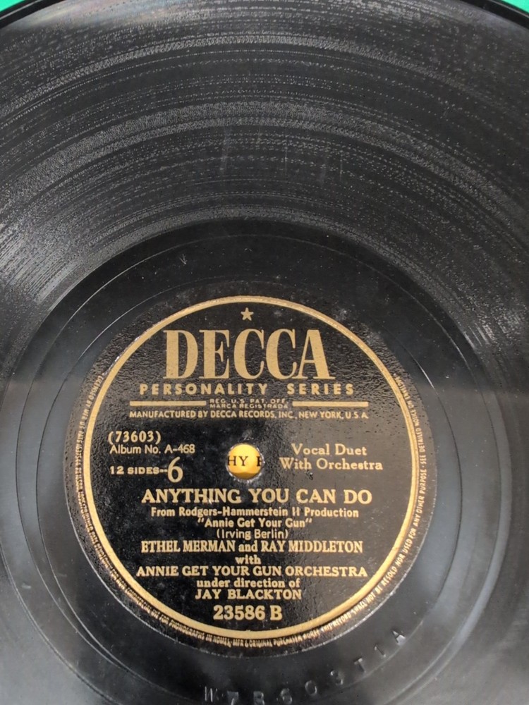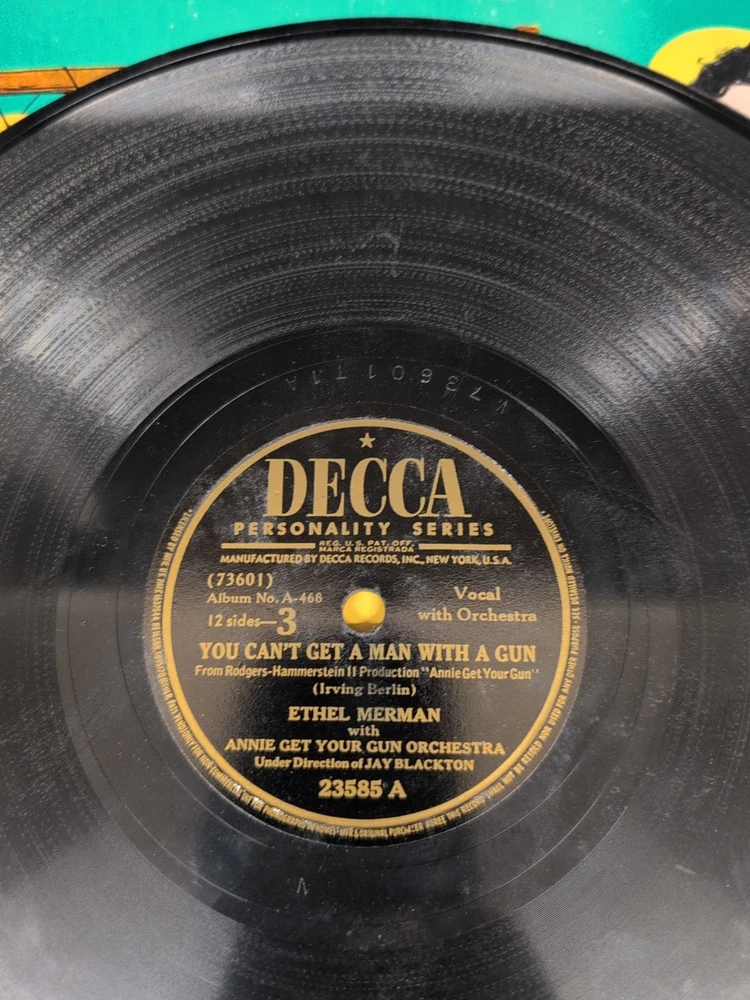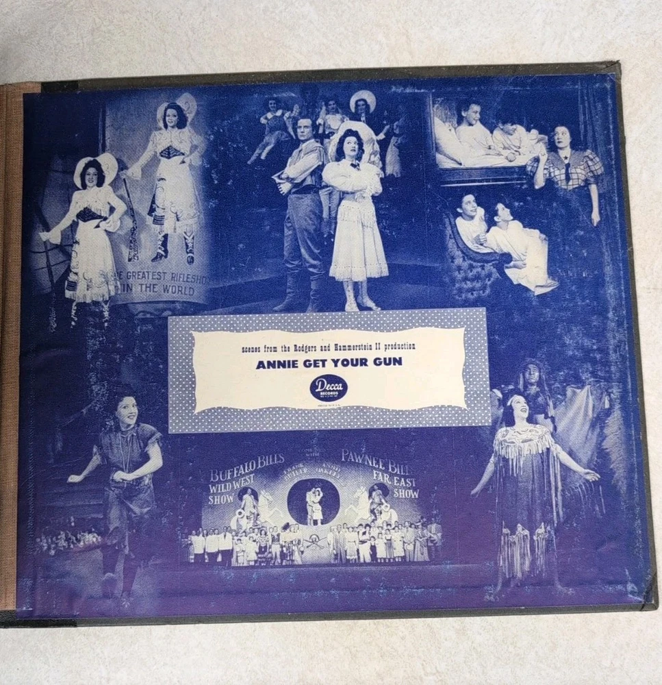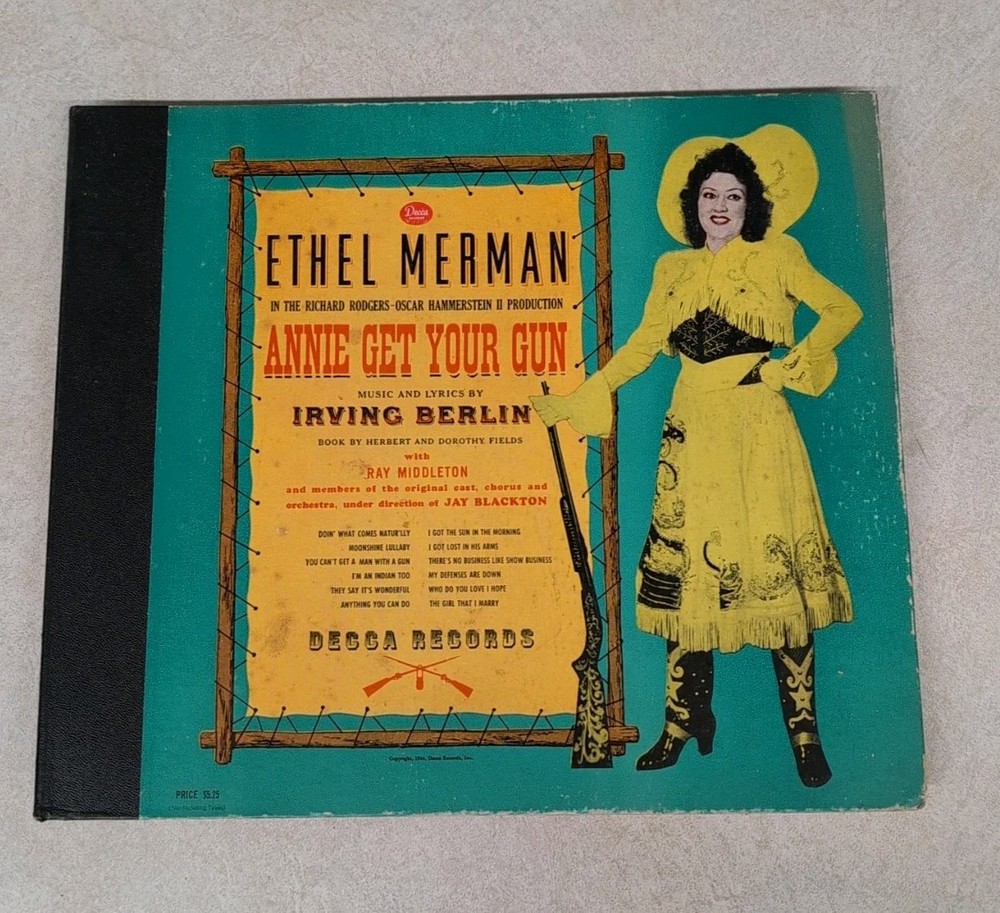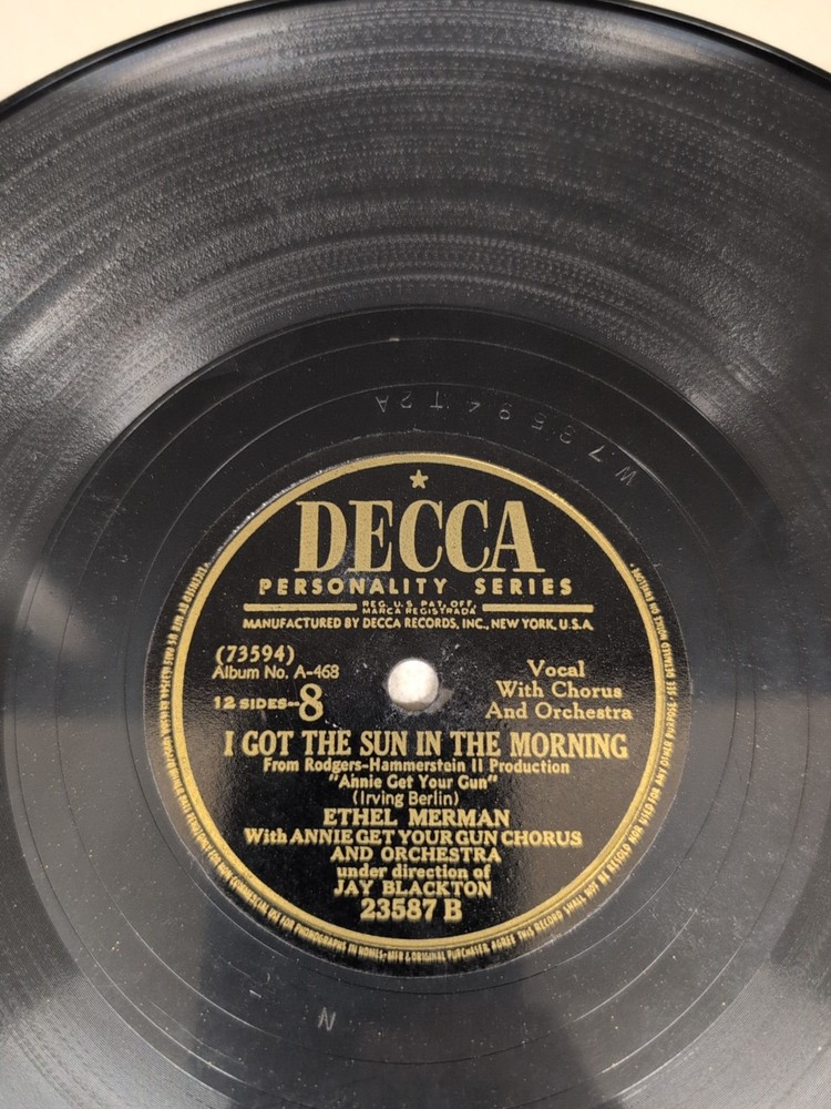 This is a 1946 10" shellac record box set featuring Ethel Merman in "Annie Get Your Gun." Conducted by Jay Blackton, released by Decca on 78 RPM format. The catalog number is A-468. It falls under the Soundtracks & Musicals genre in English language. this item is eligible for a "Buy 2 Get 1 Free" offer. Have 5 of the 6 records remaining. Perfect for those looking to replace missing records from your own personal collection. I Got Lost in Your Arms I Got the Sun In the Morning Anything You Can Do They Say It's Wonderful Who Do You Love I Hope Show Business You Can't Get A Man With A Gun I'm An Indian Too Moonshine Lullaby Doin' What Comes Natur'lly