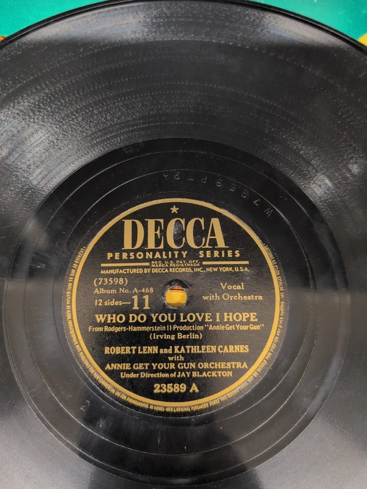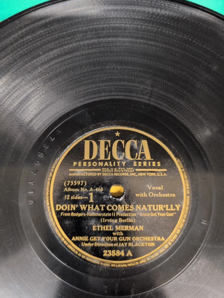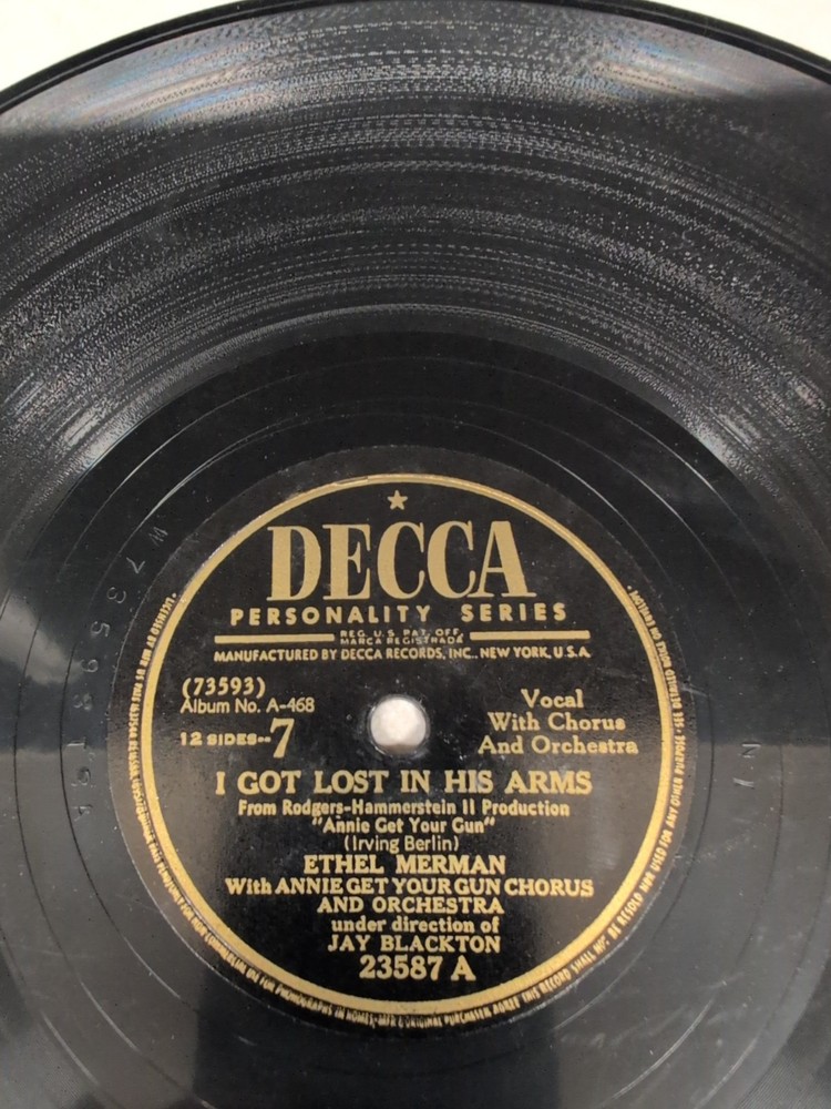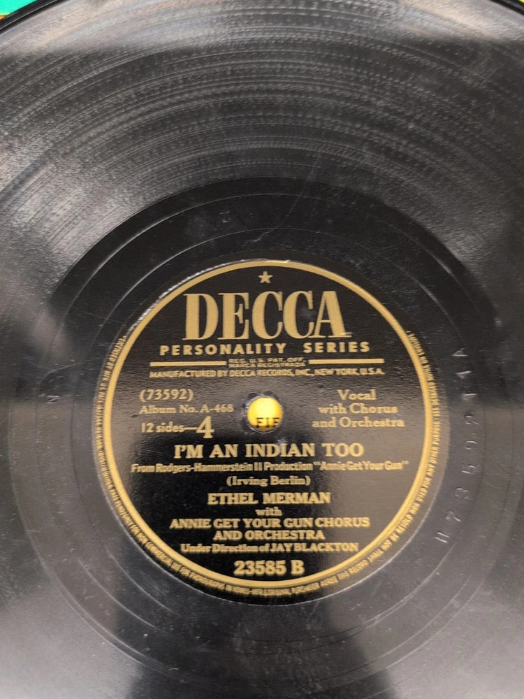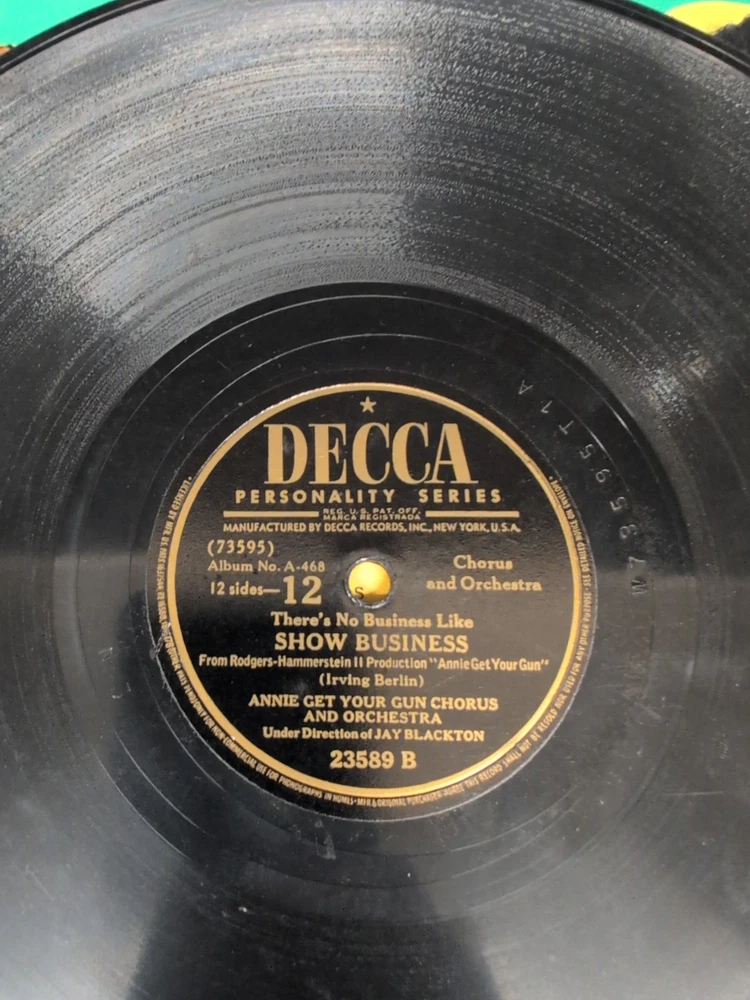 This is a 1946 10" shellac record box set featuring Ethel Merman in "Annie Get Your Gun." Conducted by Jay Blackton, released by Decca on 78 RPM format. The catalog number is A-468. It falls under the Soundtracks & Musicals genre in English language. this item is eligible for a "Buy 2 Get 1 Free" offer. Have 5 of the 6 records remaining. Perfect for those looking to replace missing records from your own personal collection. I Got Lost in Your Arms I Got the Sun In the Morning Anything You Can Do They Say It's Wonderful Who Do You Love I Hope Show Business You Can't Get A Man With A Gun I'm An Indian Too Moonshine Lullaby Doin' What Comes Natur'lly