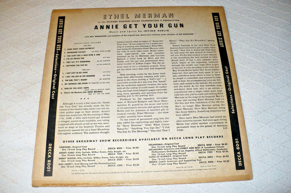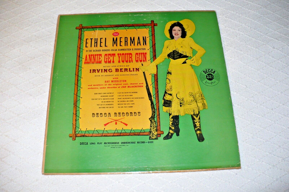 Ethel Merman with Ray Middleton and Cast Members Annie Get Your Gun Decca 8001 (Mono) Year: 1949 (ORIGINAL BLACK Decca Labels) Vinyl (VISUAL GRADING): VG+: A couple very lite, superficial marks from sleeve, nothing deep. Very shiny. Clean labels. Good lookin' 75 year old vinyl. PLAY Grade is VG+-- S1 played VG++, S2 played VG+ with a couple lite scattered ticks. A fine listen to a legendary performer in one of her greatest roles. NO SKIPS, NO STICKS. Cover: VG: No writing, no splits . Bottom seam is taped very neatly. All text is legible. Remarkably vibrant after 75 years. LOOK at pics. What you see is what you get. Goldmine Price Guide grading standards are used. Songs: A1 Doin' What Comes Natur'lly A2 Moonshine Lullaby A3 You Can't Get A Man With A Gun A4 I'm An Indian Too A5 They Say It's Wonderful A6 Anything You Can Do B1 I Got Lost In His Arms B2 I Got The Sun In The Morning B3 The Girl That I Marry B4 My Defenses Are Down B5 Who Do You Love I Hope B6 There's No Business Like Show Business