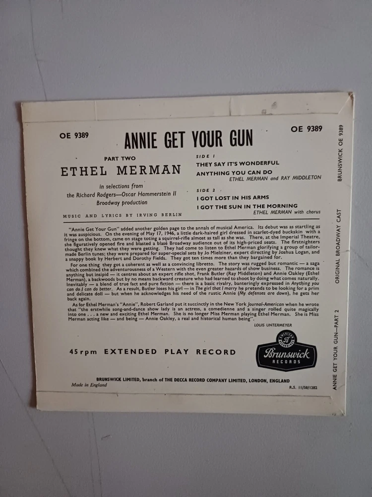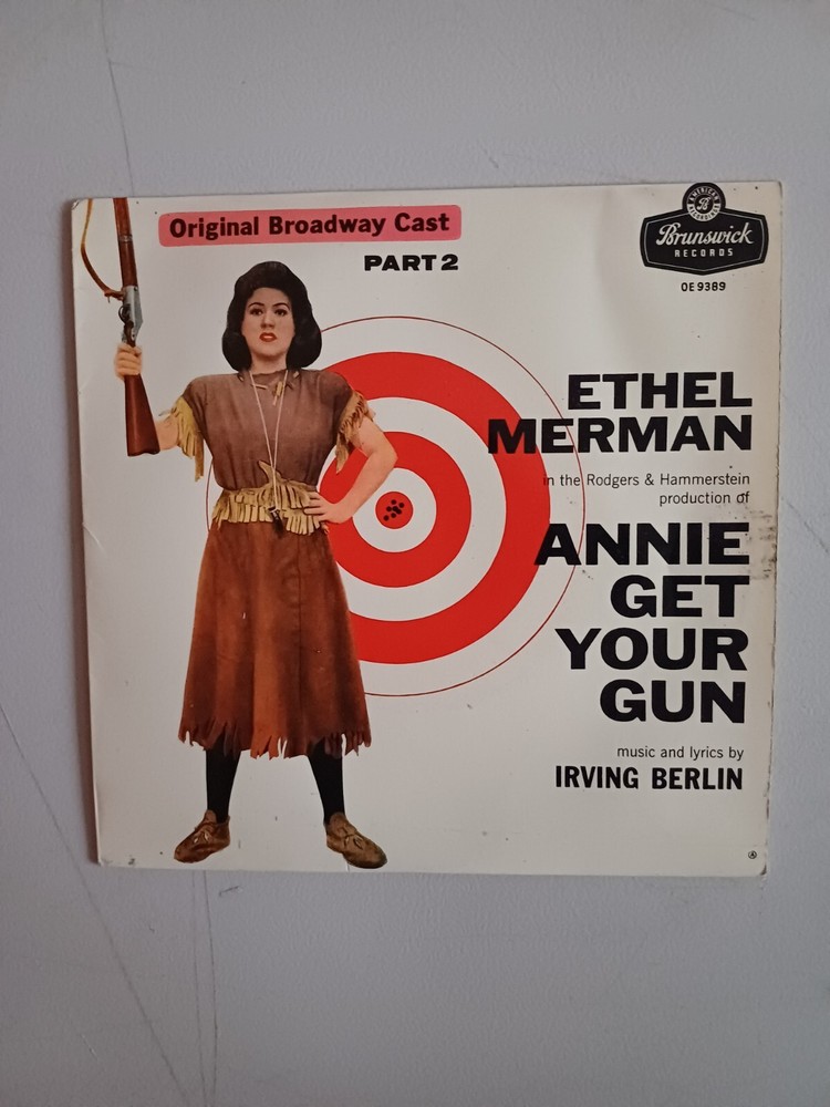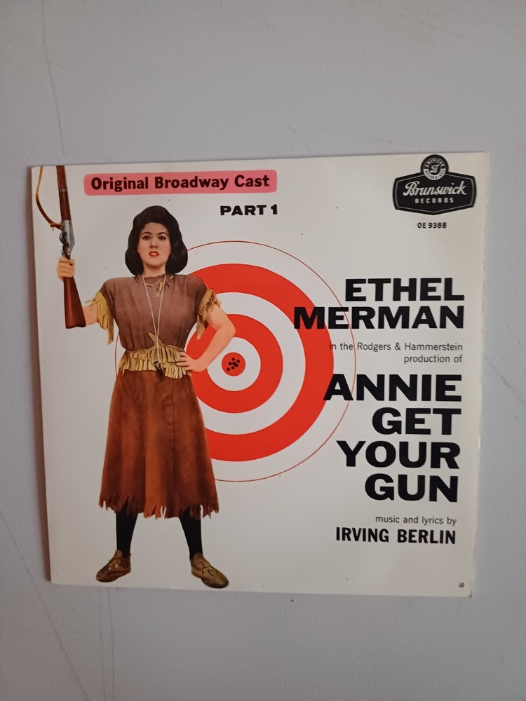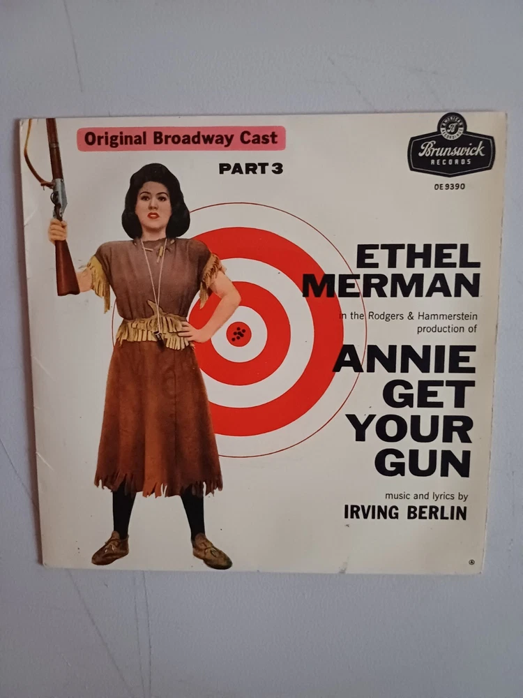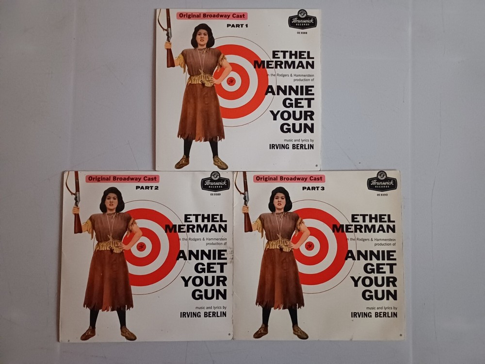 Rare vinyl single set by Ethel Merman for "Annie Get Your Gun," consisting of Parts 1, 2, and 3. Released by Brunswick Records in a cardboard sleeve. This first edition 7" vinyl set is in excellent condition. A collector's item for fans of vintage records. Thanks for looking and any questions please ask 😊