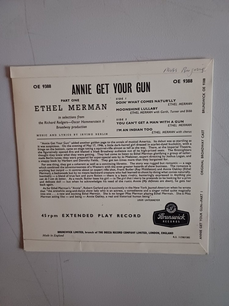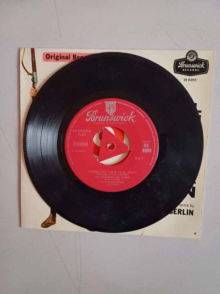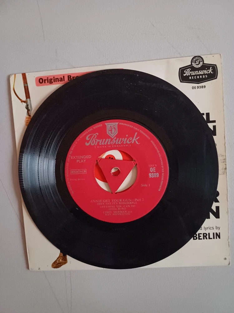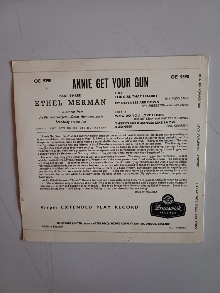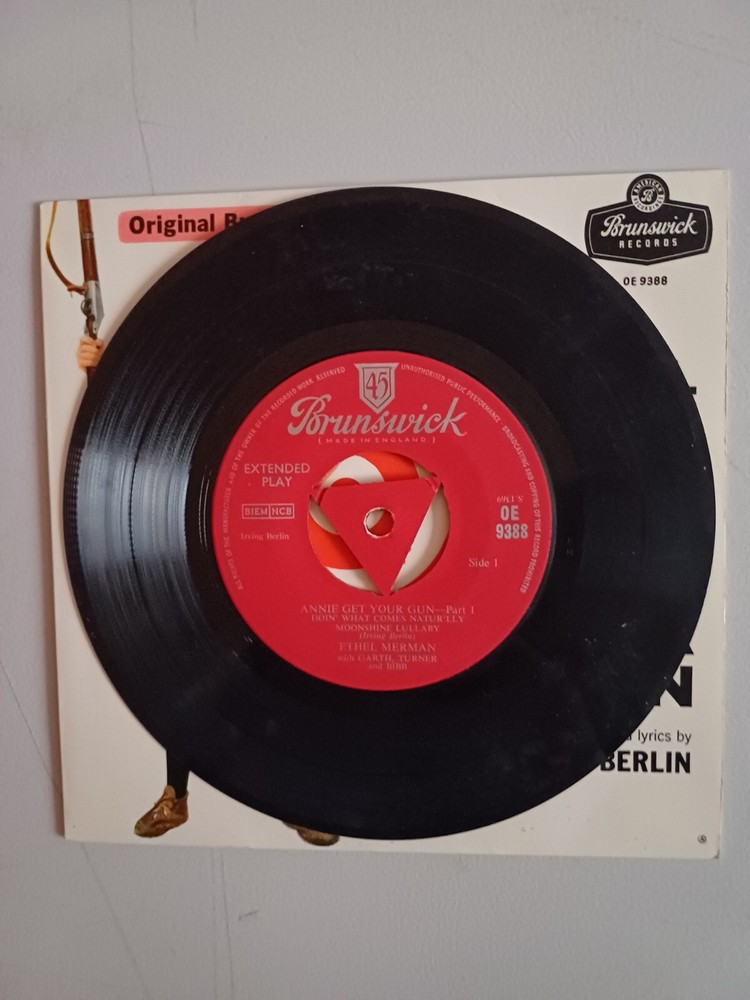 Rare vinyl single set by Ethel Merman for "Annie Get Your Gun," consisting of Parts 1, 2, and 3. Released by Brunswick Records in a cardboard sleeve. This first edition 7" vinyl set is in excellent condition. A collector's item for fans of vintage records. Thanks for looking and any questions please ask 😊
