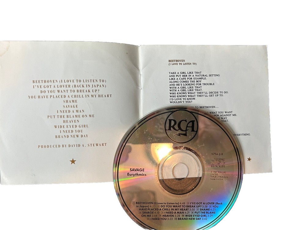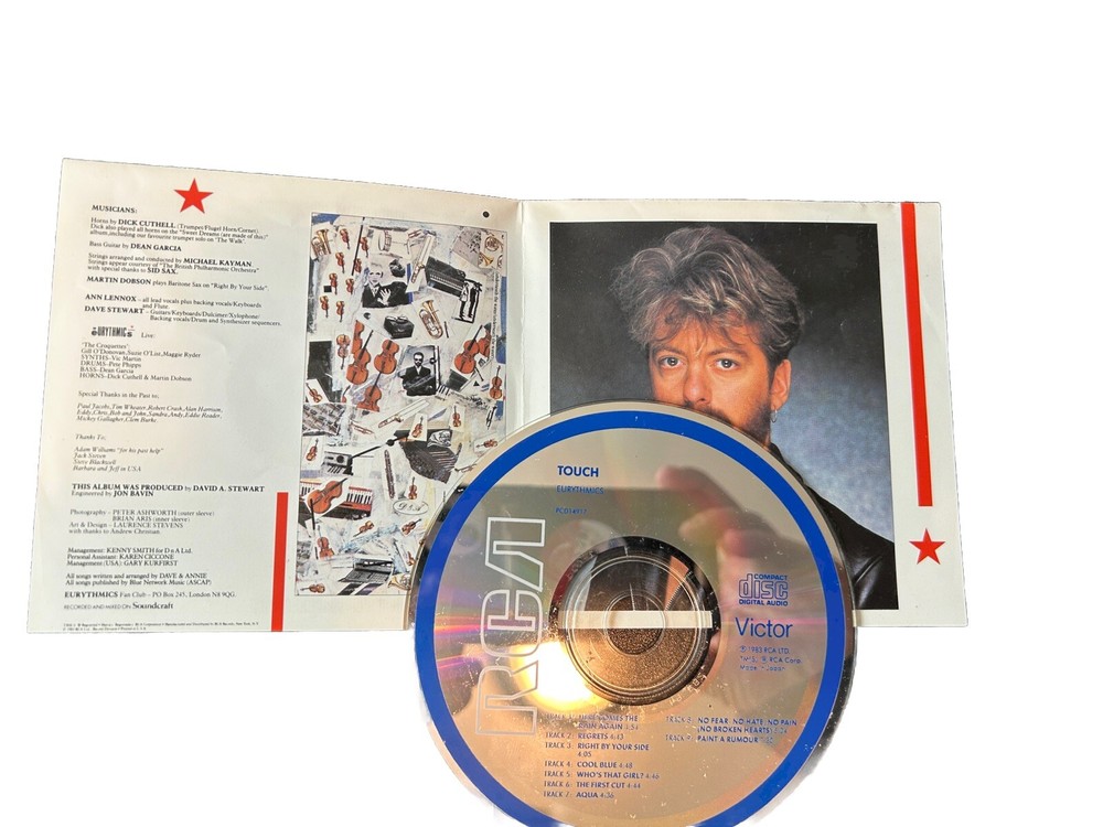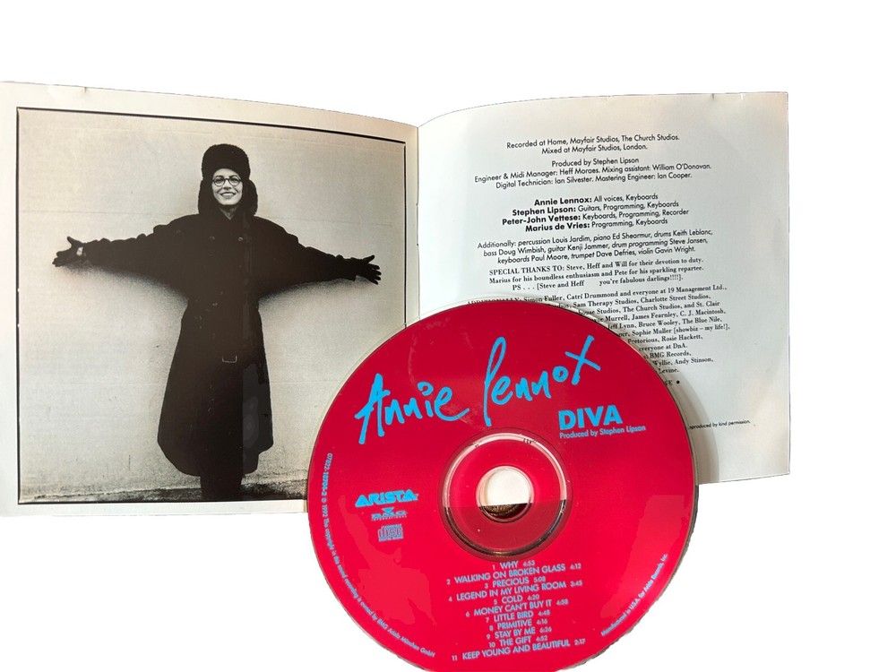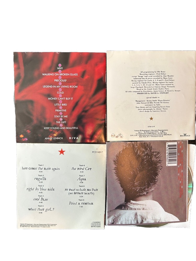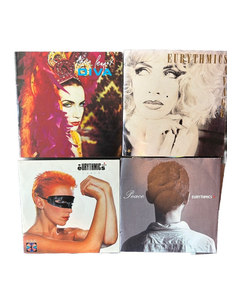 The product is a 4 CD lot featuring music by Annie Lennox and Eurythmics, including albums like "Peace," "Diva," and more. The CDs are in very good condition. The music style is a mix of new wave, pop rock, and alternative, with songs from the 1980s. The CDs were released in the United States by the record label Arista.