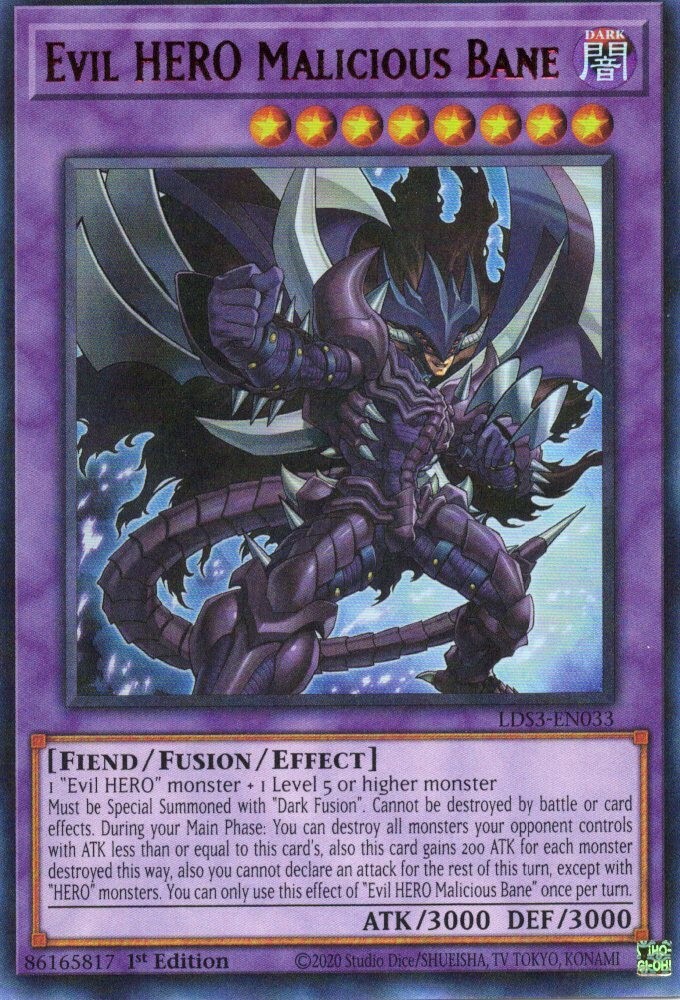 The Evil HERO Malicious Bane (Red) card from the Yu-Gi-Oh! TCG is an Ultra Rare collectible in English language. This Dark attribute Fiend type card has a high Defense and Attack power of 3000, making it a formidable addition to any deck. Manufactured by Konami, this 1st Edition card is part of the Legendary Duelists: Season 3 set, featuring unique features and gameplay. Perfect for collectors and players alike, this Evil HERO card is a valuable addition to any card collection.