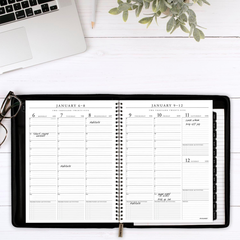 Menu Other Items Feedbacks About Us Contact Us Add To Favorites Executive 2025 Appointment Book Planner, Weekly & Monthly, 8-1/4" X 11", Large, Zipper, Black (70NX810525) YEAR ROUND PLANNING – Planner covers 12 months from January 2025 — December 2025 with Julian dates GUARANTEED TO LAST ALL YEAR – ACCO Brands will replace any defective AT-A-GLANCE planner that is returned within one year from the date of purchase. This does not cover damage due to misuse or abuse. INK BLEED RESISTANCE – Plan your schedule without fear of distracting ink bleeding. Our high-quality paper is designed for ink bleed resistance, which keeps plans neat and legible. WEEKLY VIEWS – One week per two page spread features quarter-hourly appointments 8:00 a.m. — 5:45 p.m. Monday to Friday with space for notes and priorities. Condensed weekends are untimed for flexibility. Pages measure 8-1/4" x 11". MONTHLY OVERVIEWS – One month per two page spread has unruled daily blocks and past and future month calendars for quick reference. Months are tabbed for easy navigation. SPECIAL FEATURES – Includes removable, ruled notepad. Special pages include important dates, future planning, expense tracking and contacts pages. PROFESSIONAL DESIGN – Take charge of your schedule with classic style. Zipper closure helps keep your plans secure. Planner has a durable black faux leather cover and twin wire binding to help prevent snags and secure pages. REFILL AVAILABLE – Weekly planning page refill (70911) Confidently face every deadline this year with the AT-A-GLANCE Executive Weekly Monthly Appointment Book Planner. Date range covers 12 months from January 2025 — December 2025 with Julian dates. Guaranteed to last all year.* Plan your schedule without fear of distracting ink bleeding. High-quality paper is designed for ink bleed resistance, which keeps plans neat and legible. One week per two page spread features quarter-hourly appointments 8:00 a.m. — 5:45 p.m. Monday to Friday with space for notes and priorities. Condensed weekends are untimed for flexibility. Pages measure 8-1/4" x 11". Great for long-term planning, each one month per two page spread features unruled daily blocks for open scheduling. Monthly pages feature space for notes and priorities. Months are tabbed for easy navigation. Expand your organizational skills with special features. Includes removable, ruled notepad. Special pages include important dates, future planning, expense tracking and contacts pages. Take charge of your schedule with classic style. Zipper closure helps keep your plans secure. Planner has a durable black faux leather cover and twin wire binding to help prevent snags and secure pages. Weekly planning page refill (70911) and notepad refill sold separately. *ACCO Brands will replace any AT-A-GLANCE planner that is returned within one year from the date of purchase. This does not cover damage due to misuse or abuse. Item Specification Item model number 70NX810525 Ink Color Black Style 2025 New Edition Material Paper Special Feature Removable Notepad, Special Pages (Important Dates, Future Planning, Expense Tracking, Contacts) Number of Items 1 Format Organizer, Notebook Color Black Material Type Paper Cover Material Faux Leather Calendar Type Weekly & Monthly Binding Spiral-bound Manufacturer Part Number 70NX810525 Item Weight 2.56 pounds Pattern Name Cover & Refill - Large Ruling Ruled (some pages) Year 2025 Target Audience Teacher, Adult, Student Product Dimensions 12.5 x 10 x 1.2 inches Dimensions Shipping Returns Additional Info Product Dimensions: 10.0 inches x 12.5 inches x 1.2 inches. Weight: 2.56 lb Fast shipping is very important for us. Our standard shipping service is FREE. Your order will be shipped within 1-3 business days upon full payment received. Most items are delivered within 3-5 business days, however, please allow 3-10 business days. We are shipping only to USA. We only ship to the confirmed Paypal address. We reserve the right to cancel any order for any reason at any time. We are not responsible for undeliverable addresses. We offer a 30 day return policy from checkout winning date. Your satisfaction is guaranteed! If for any reason you are unhappy with your item, just return it within 30 days for a full refund, minus shipping cost. Please contact us prior to initiating a return so that we can issue you a refund authorization. Items defective upon receipt must be packaged in their retail packaging as if new and returned with a detailed description of the problem. Return shipping fees are not refundable. We reserve the right to decline any returns if the above guidelines are not followed. All of our items, unless otherwise stated, will only run on 120 volts. Please check to make sure your country complies with these specifications. If you have a problem or question regarding your transaction please contact us before leaving any type of feedback. We will work with you to resolve any problem you may have.