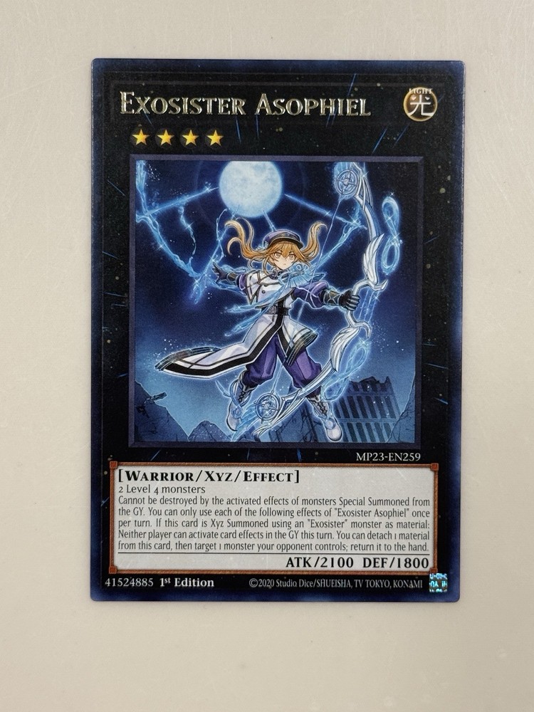 The Exosister Asophiel MP23-EN259 card is a rare, English 1st Edition card from the 25th Anniversary Tin: Dueling Heroes Mega Pack in the Yu-Gi-Oh! TCG. This Warrior-type card has a high defense of 1800 and attack power of 2100, making it a formidable addition to any deck. Manufactured by Konami, this Effect Xyz card is a valuable collectible for fans of the game.