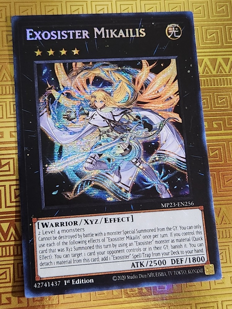 | Card Text | 2 Level 4 monsters Cannot be destroyed by battle with a monster Special Summoned from the GY. You can only use each of the following effects of "Exosister Mikailis" once per turn. If you control this card that was Xyz Summoned this turn by using an "Exosister" monster as material (Quick Effect): You can target 1 card your opponent controls or in their GY; banish it. You can detach 1 material from this card; add 1 "Exosister" Spell/Trap from your Deck to your hand. |