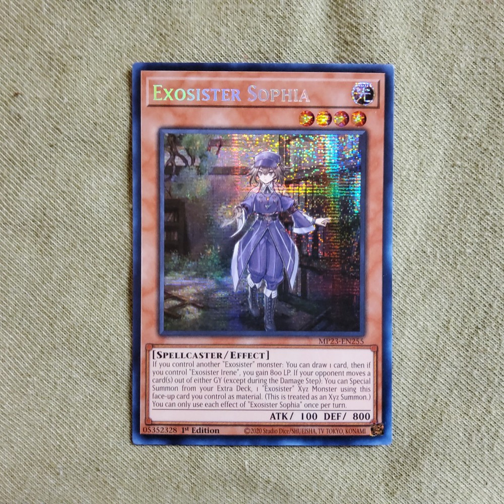 Unleash the power of strategy with the Exosister Sophia card from the 25th Anniversary Tin: Dueling Heroes Mega Pack. As an Effect-type Spellcaster creature, this card offers a unique blend of attack and defense, with an attack power of 100 and a defense toughness of 800, ensuring that it can withstand a fair amount of damage while dealing out its own. Boasting the sought-after Prismatic Secret Rare rarity, Exosister Sophia card number MP23-EN255 is a must-have for both serious collectors and competitive players. It's also a 1st Edition piece, adding to its appeal. Konami's craftsmanship is evident in the detailed artwork and the card's overall quality, making it a standout addition to any Yu-Gi-Oh! TCG collection.