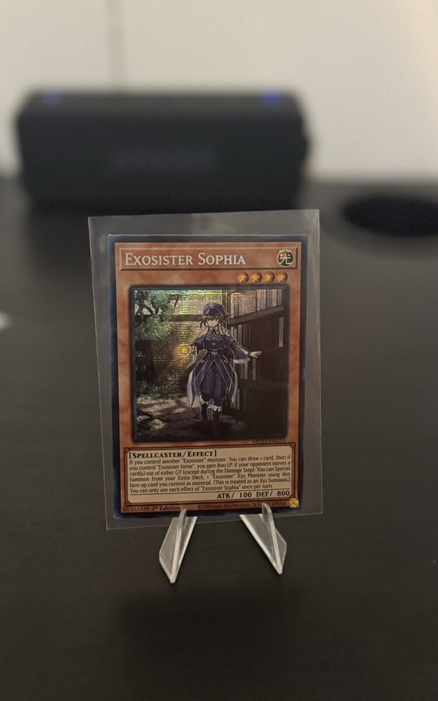 Introducing the Exosister Sophia MP23-EN255 card from the 25th Anniversary Tin: Dueling Heroes Mega Pack of the Yu-Gi-Oh! TCG. This card features a Light attribute and a Prismatic Secret Rare rarity. It is an Effect type card with 100 attack power and 800 defense/toughness. The card is in English language and is manufactured by Konami. This collectible card is ideal for fans of the Yu-Gi-Oh! TCG game. The card number is MP23-EN255 and it belongs to the Spellcaster creature/monster type. It is a 1st edition card and is perfect for collectors of CCG individual cards. Get your hands on this rare and valuable card today!