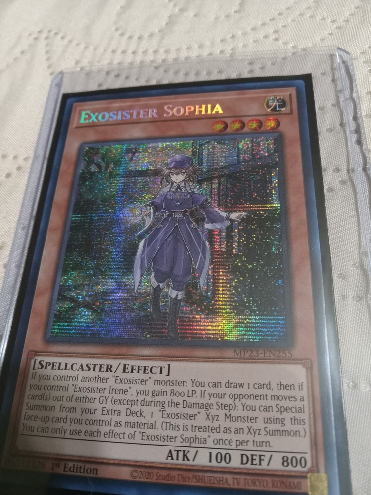 Dive into the 25th Anniversary Tin: Dueling Heroes Mega Pack with the formidable "Exosister Sophia" card, MP23-EN255. As a Spellcaster-type Effect card, Exosister Sophia offers a dual benefit: if you control another "Exosister" monster, you draw a card and gain 800 Life Points if you control "Exosister Irene". Additionally, if your opponent moves a card(s) out of either GY, you can Special Summon an "Exosister" Xyz Monster using this face-up card as material, an effect that can be used once per turn. Boasting a Prismatic Secret Rare rarity and the sought-after 1st Edition feature, this card is a must-have for collectors and players alike. With an Attack/Power of 100 and Defense/Toughness of 800, Exosister Sophia is not just a powerful addition to your deck but also a treasured piece for your collection, produced by the renowned Konami and presented in English.