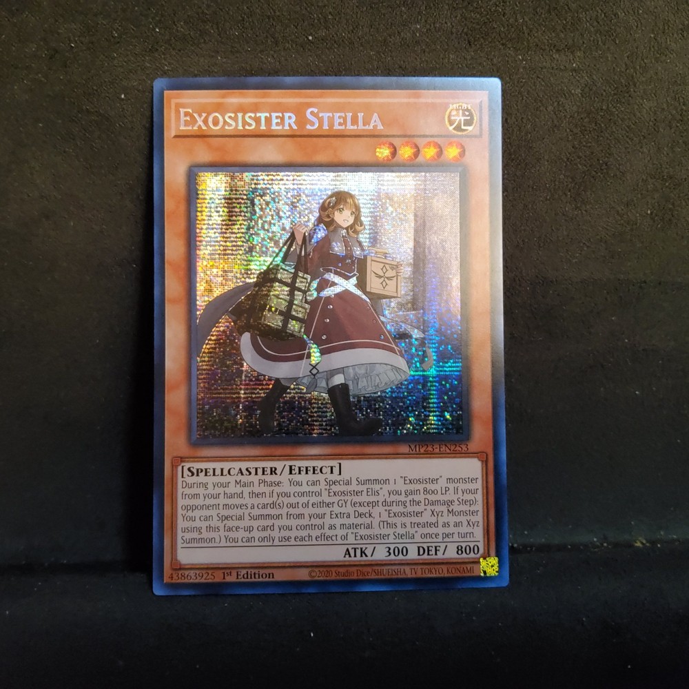 The Exosister Stella MP23-EN253 25th Anniversary Tin: Dueling Heroes Mega Pack is a special edition card from the Yu-Gi-Oh! TCG featuring a Light attribute with a high defense and attack power of 800 and 300 respectively. This Prismatic Secret Rare card is a Spellcaster type with an Effect card number, manufactured by Konami and part of the 25th Anniversary Tin set. The English language card is a 1st Edition release, making it a sought-after collectible for fans and players alike.