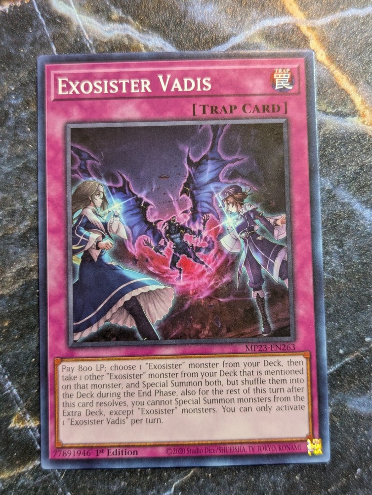 This Exosister Vadis card is a must-have for any Yu-Gi-Oh! TCG collector. With its rare 1st edition status and unique trap-normal card type, it's sure to be a valuable addition to your collection. The card is in English and features the card number MP23-EN263. It's perfect for players who enjoy dueling heroes and collecting cards. The card is manufactured by Konami and is part of the 25th Anniversary Tin: Dueling Heroes Mega Pack. This card is a common/short print and is ideal for anyone who wants to complete their collection.