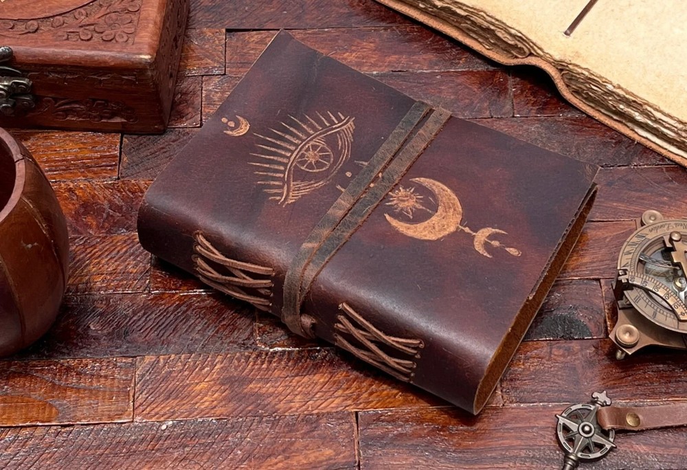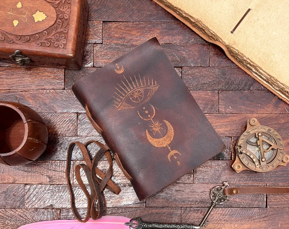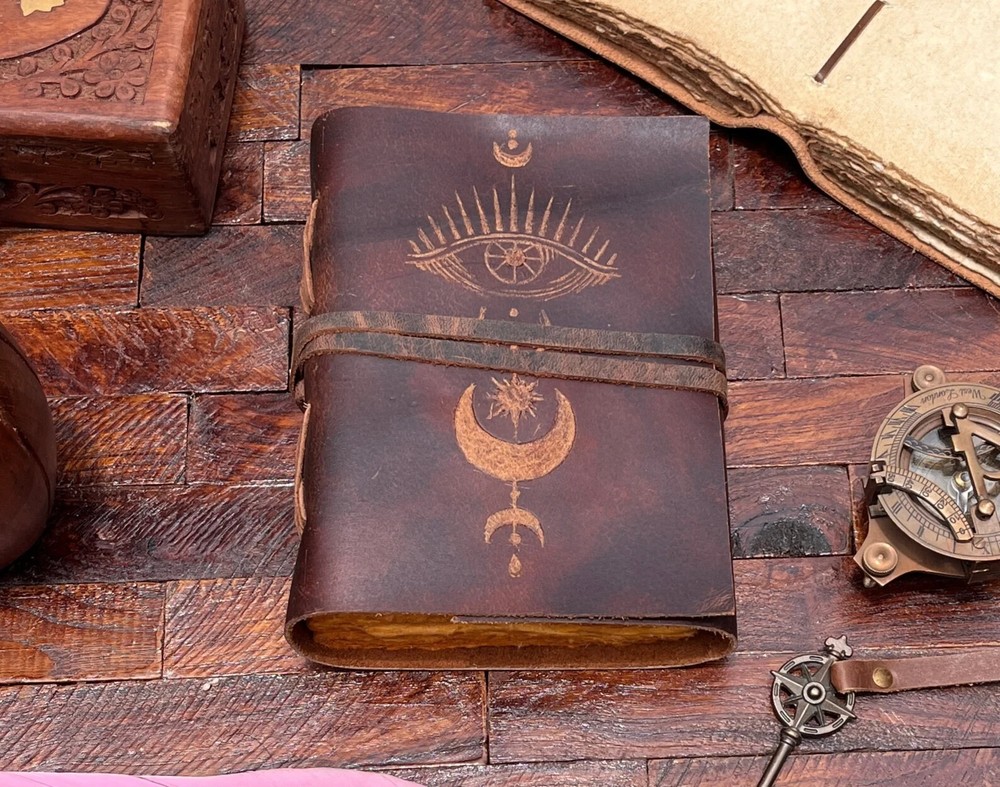 The Eye Leather Journal is a luxurious vintage travel journal featuring an embossed eye and moon design on the leather cover. Handmade in India, this limited edition journal is personalized and perfect for those looking to document their travels in style. The 1st edition of this unique journal is ideal for those seeking a special and distinctive writing experience. Howling wolf leather Journal | embossed wolf, vintage journal | travel journal | blank spell book of shadows, grimoire journal. Active ★ Howling wolf Journal This Journal Is Made From A High Quality Leatherette With A Heart Embossed Finish And Vintage Looking Paper ★ DIMENSIONS :- The Journal Is Available In 2 Perfect Sizes. 8 Inches" x 6 Inches. 7 Inches" x 5 Inches. ★ PAPER :-The Inside Of This Journal Is Handmade Decal Edge Paper That Looks Vintage And Well Stitched Whose Number Is 200 (Please Count Both side) If You Want White Plain Paper So Please Select Right Paper Option There Are Two Options Available. ★ HANDCRAFTED FROM GENUINE LEATHER: Each Journal Is Specially Designed And Handmade From Premium Leather. Artful Hand Stitching To Create A Timeless Space For Your Thoughts. ★ TELL YOUR STORY :- We Designed This Classic Leather Journal As A Time Capsule For Your Thoughts. Capture Your Important Memories, Accomplishments (And Failures), Life-Changing Moments And Evolving Dreams As A Keepsake To Reflect Upon In Years To Come. ★ THE PERFECT GIFT :-Quality You Can Trust: High-Quality Craftsmanship Makes This An Essential Tool For Poetry, Art, Sketching, Writing, Drawing, Calligraphy Leather Journal Give Your Loved Ones A Thoughtful Gift That Will Last For Years To Come! Great For A Birthday, Anniversary, Or Graduation Ignore :- Travel journal Antique journal Handmade leather journal Sun and moon Leather journal celestial embossed Book of shadows Grimoire journal Sun and moon journal Blank spell book Magic moon Ying yang celestial sun and moon Celestial journal Journal for women Magic book