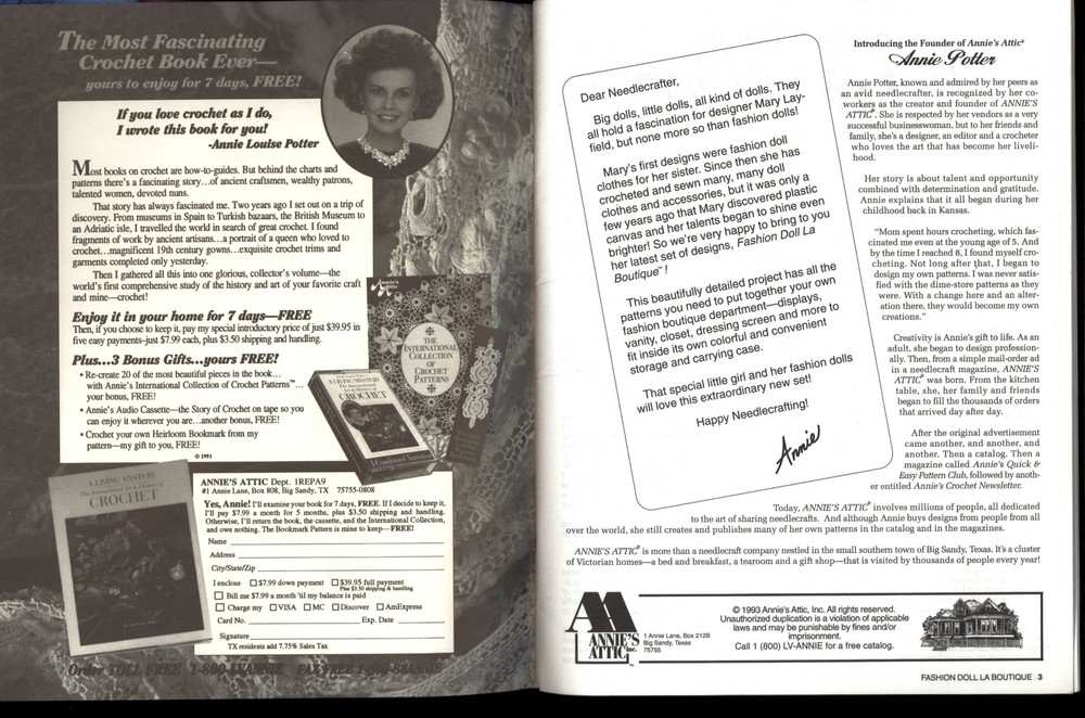FASHION DOLL (Barbie) LA BOUTIQUE by Annie's Attic 1993* PLASTIC CANVAS FASHION DOLL (Barbie) LA BOUTIQUE by Annie's Attic 1993* PLASTIC CANVAS the scans are from the items listed softcover by Annie's Attic print date 1993 pages - 15 + pull out pattern My item code 012825 la Boutique Barbie shipping will be in a stay flat photo mailer I do combine shipping so check the rest of my listings any questions please email me Listing and template services provided by inkFrog