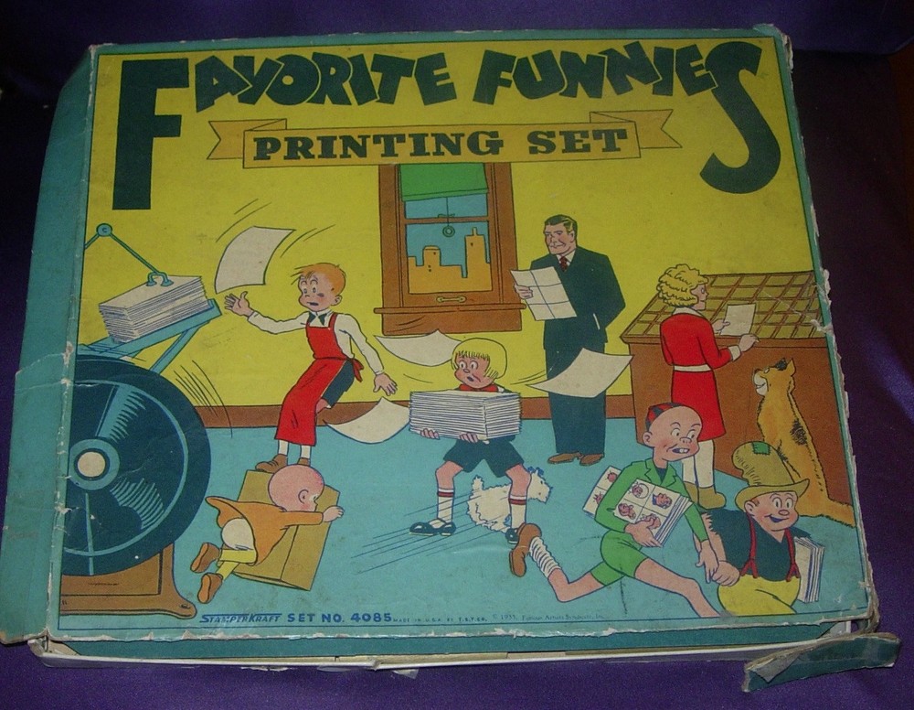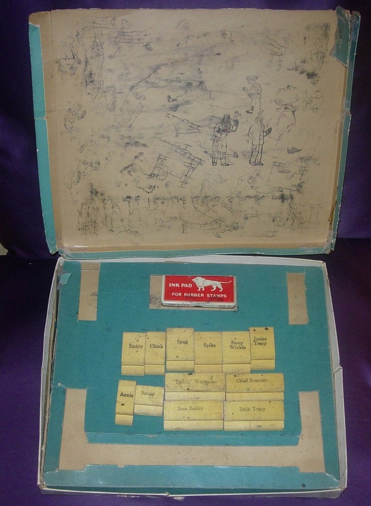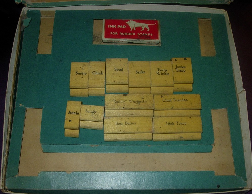 FAVORITE FUNNIES PRINTING SET STAMPER KRAFT 4085 1935 ANNIE DICK TRACY Please ake a look at the pics and ask questions. The box is rough but displayable Side and corner splitting. some pieces of sides and side panels are split off the lid. There is a long loose piece under the insert tray. Again, box is rough but top panel of lid is still quite displayable. Content include the vintage stamp pad, obviously hard by now, and 12 character stamps as shown. Not a bad set though not quite complete as far as I can tell. Appears to be missing a couple stamps.