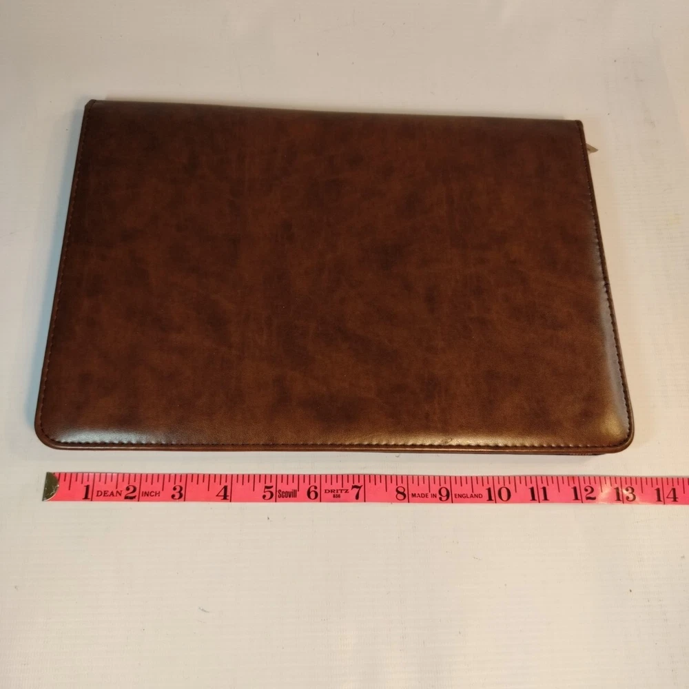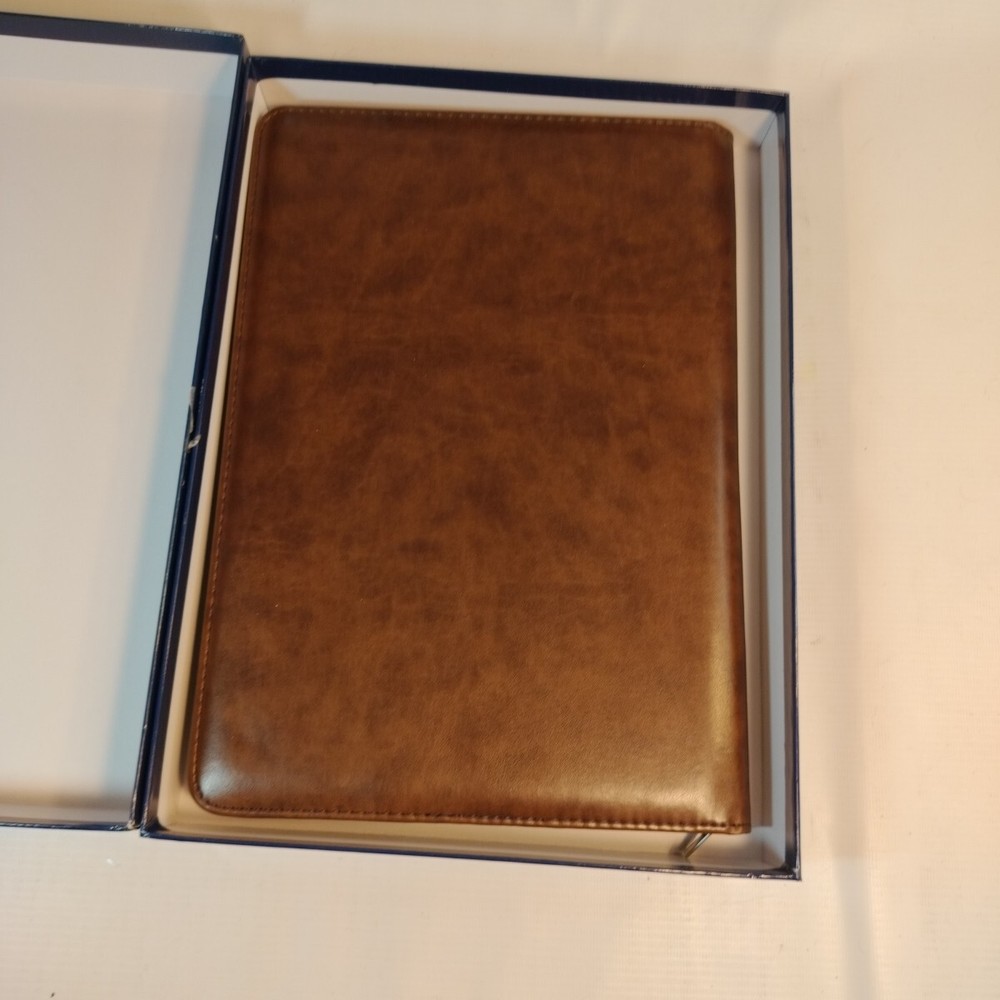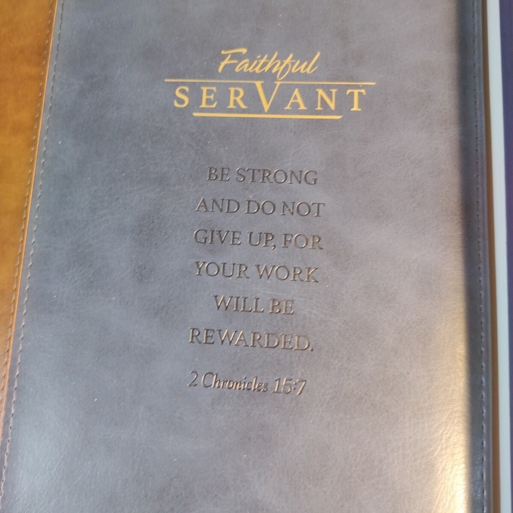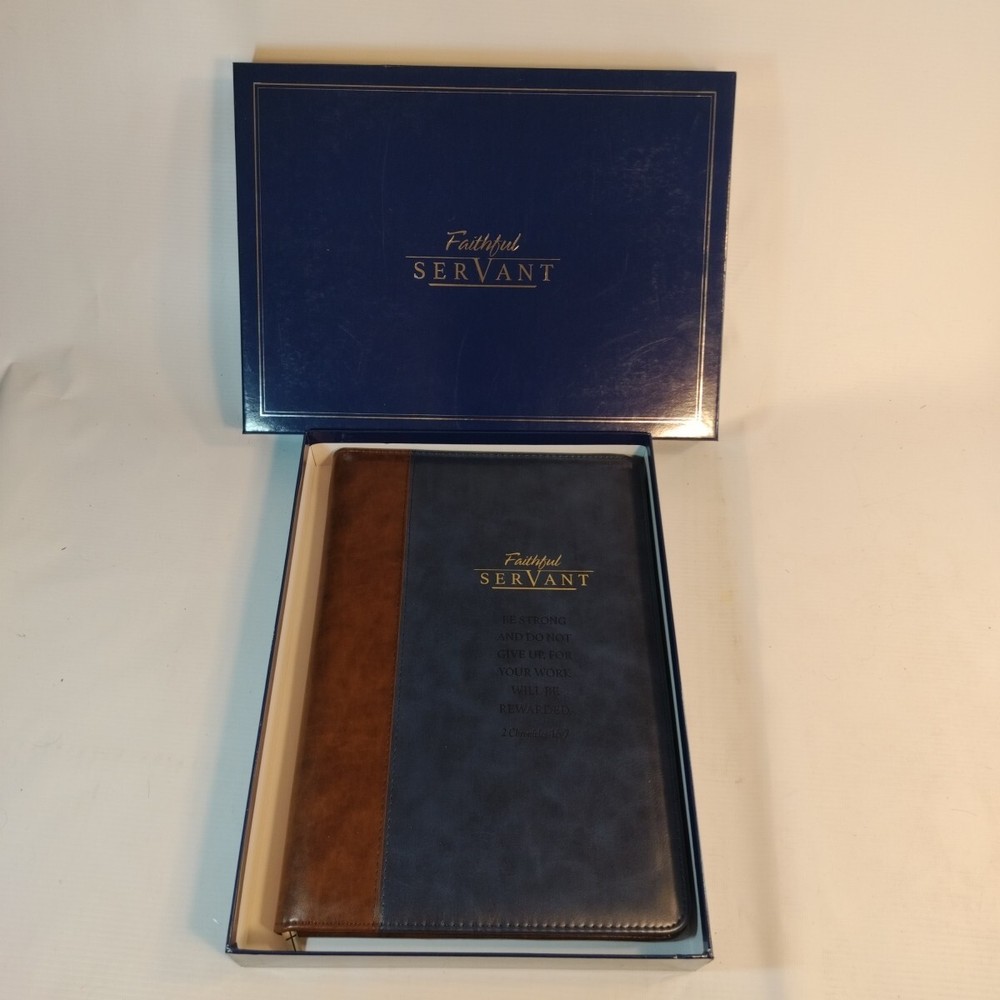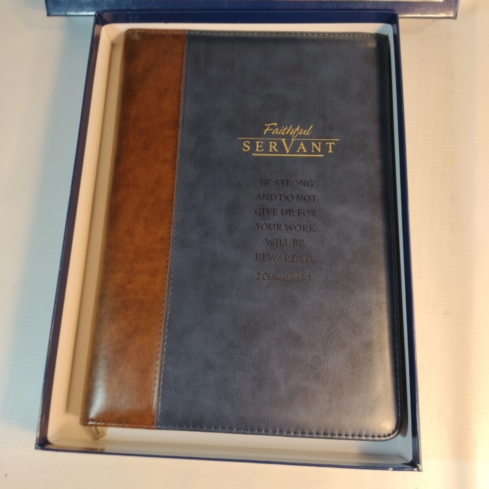 This leather bound folder binder is perfect for those who value organization and style. The binder is designed with high-quality leather material that ensures durability and a sleek look. It features a planner layout that is perfect for organizing important dates and events. The binder is ideal for individuals who want to stay organized without sacrificing style. The Faithful Servant Leather Bound Folder Binder is a must-have for anyone who wants to stay on top of their schedule. The binder is perfect for professionals and students alike who value efficiency and style. It is a great addition to any office or home and is sure to impress. **Open box like new condition being sold as is please reference all photos additional tags faithful servant be strong and do not give up for your work will be rewarded 2 Chronicles 15:7