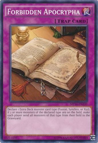 Please, carefully read the following: Image shown is a stock photo and does not reflect the actual card you will be receiving. Please refer to the condition guide below, the title and item description for what you will be receiving. Please also be aware that due to plastic shortages, orders may not always come in a plastic toploader but will always be protected as much as possible to prevent damage. You will receive 1x Forbidden Apocrypha - MP16-EN230 - Common - Unlimited Edition - Condition: Near Mint Please refer to the Title and Item Description above for the item being purchased. Delivery delays: Deliveries may not always fall within the estimated delivery dates when shipping outside of Canada and USA. Many factors may contribute to delays in delivering the package such as weather and customs. Please note that delivery to international locations may take up to 8 weeks to arrive . We always ship out orders within 1 business day and after dropping off with the post office, delivery times are out of our control. Feedback: We will always leave positive feedback for you and we ask if you can do the same for us. If there is any reason why the transaction was not up to your expectations, please message us before leaving feedback so we can address the issue. Combined shipping: To receive a combined shipping quote, please make sure that you commit to purchasing on ebay.ca . This allows us to send you a combined shipping invoice before payment. Shipping within the USA (6-10 Business days): FREE! Shipping within Canada (3-8 Business days): FREE! Shipping and handling delay: We aim to ship all orders within 1 business day. We do not ship on weekends and holidays. Condition Guide: We do not sell any cards that are in MINT condition, the best condition that we offer is near mint. Near Mint (NM) - Cards in Near Mint condition show minimal to no wear from shuffling, play or handling and can have a nearly unmarked surface, crisp corners and unblemished edges outside of a few minimal flaws. A Near Mint card may have a tiny edge nick or a tiny scratch or two, but overall look nearly unplayed with no major defects or flaws. Lightly Played (LP) - Cards in Lightly Played condition may have minor border or corner wear or even just slight scuffs or scratches. There are no major defects such as water damage, bends or issues with the structural integrity of the card. Noticeable imperfections are okay, but none should be too severe or at too high a volume. Moderately Played (MP) - Cards in Moderately Played condition exhibit condition issues visible at a casual glance. Cards in Moderately Played condition can have border wear, corner wear, scratching or scuffing, creases or whitening, minor dirt buildup or any combination of mild examples of these marks. A Moderately Played card may have some form of a more major marking, such as spot water damage or creasing that doesnʼt affect card integrity, but not in combination with other issues such as scratches, scuffs or border/edge wear and not impacting a large area of the card. Heavily Played (HP) - Cards in Heavily Played condition show a severe amount of wear. Heavily Played condition can include cards that have major creasing, major whitening, major border wear or any combination of those flaws. (These flaws cannot prevent the card from being tournament playable when sleeved.) Damaged - Cards in Damaged condition can exhibit a tear, bend or crease that may make the card illegal for tournament play, even in a sleeve. Cards in Damaged condition may have extreme border wear, extreme corner wear, heavy scratching or scuffing, folds, creases or tears or other damages that impacts the structural integrity of the card.